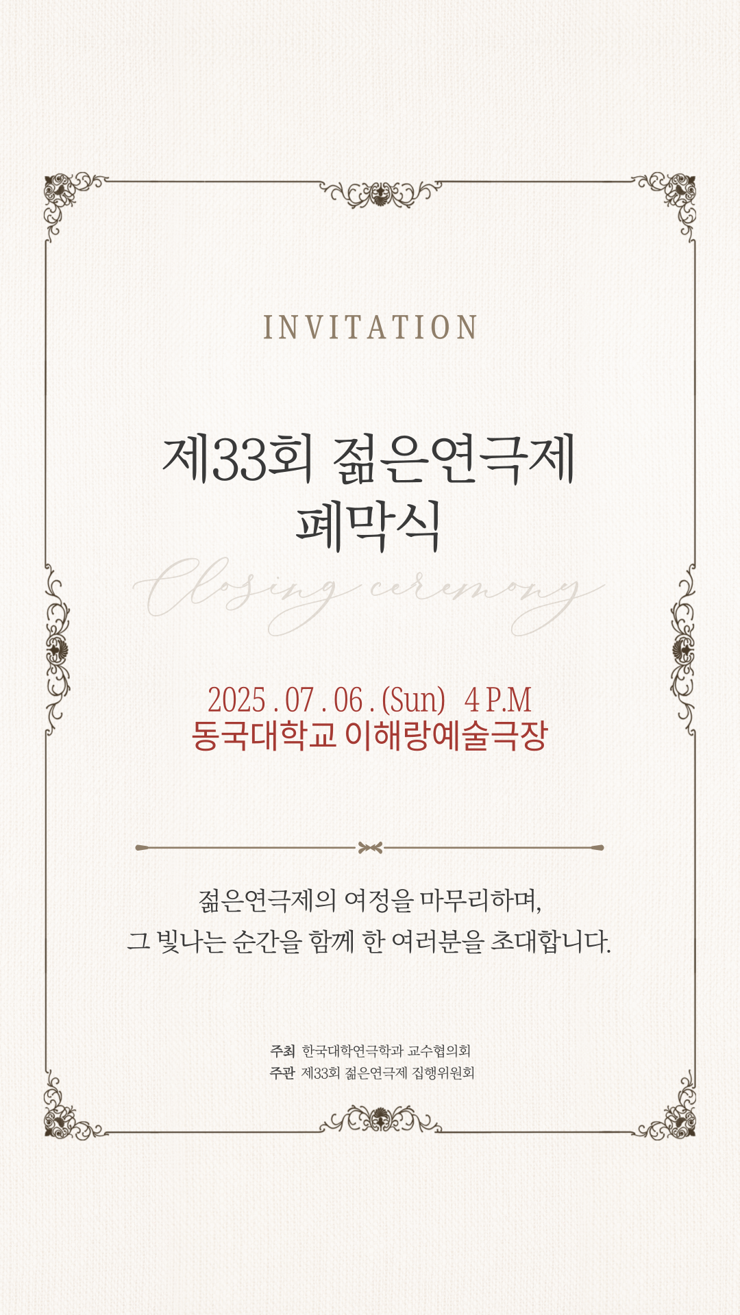 제 33회 젊은연극제 크리에이티브 퍼포먼스 상, 젊은 연기상, 젊은 스텝상 수상 게시글 상세보기 - 작성자, 조회수, 등록일, 첨부파일, 상세내용, 이전글, 다음글 제공