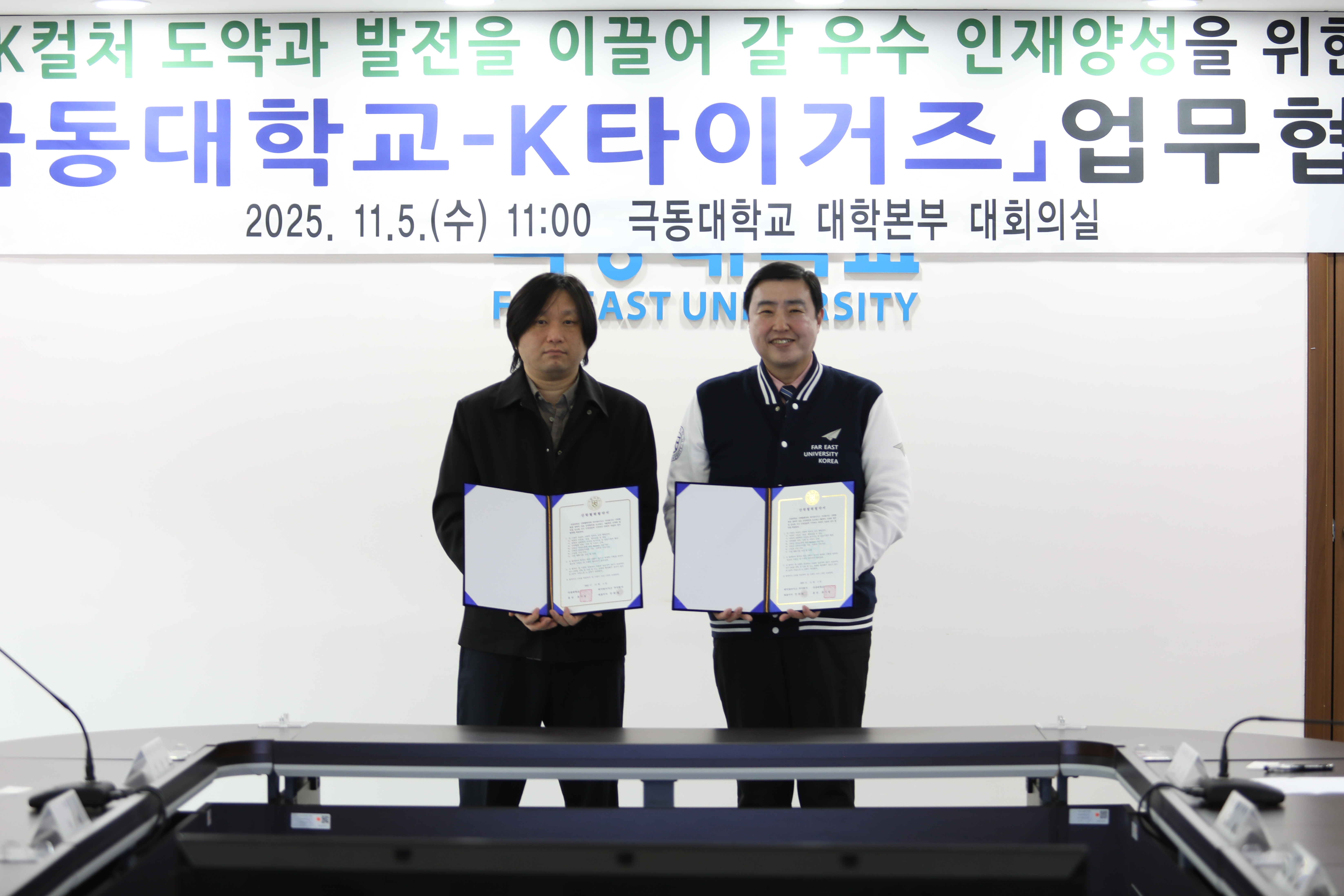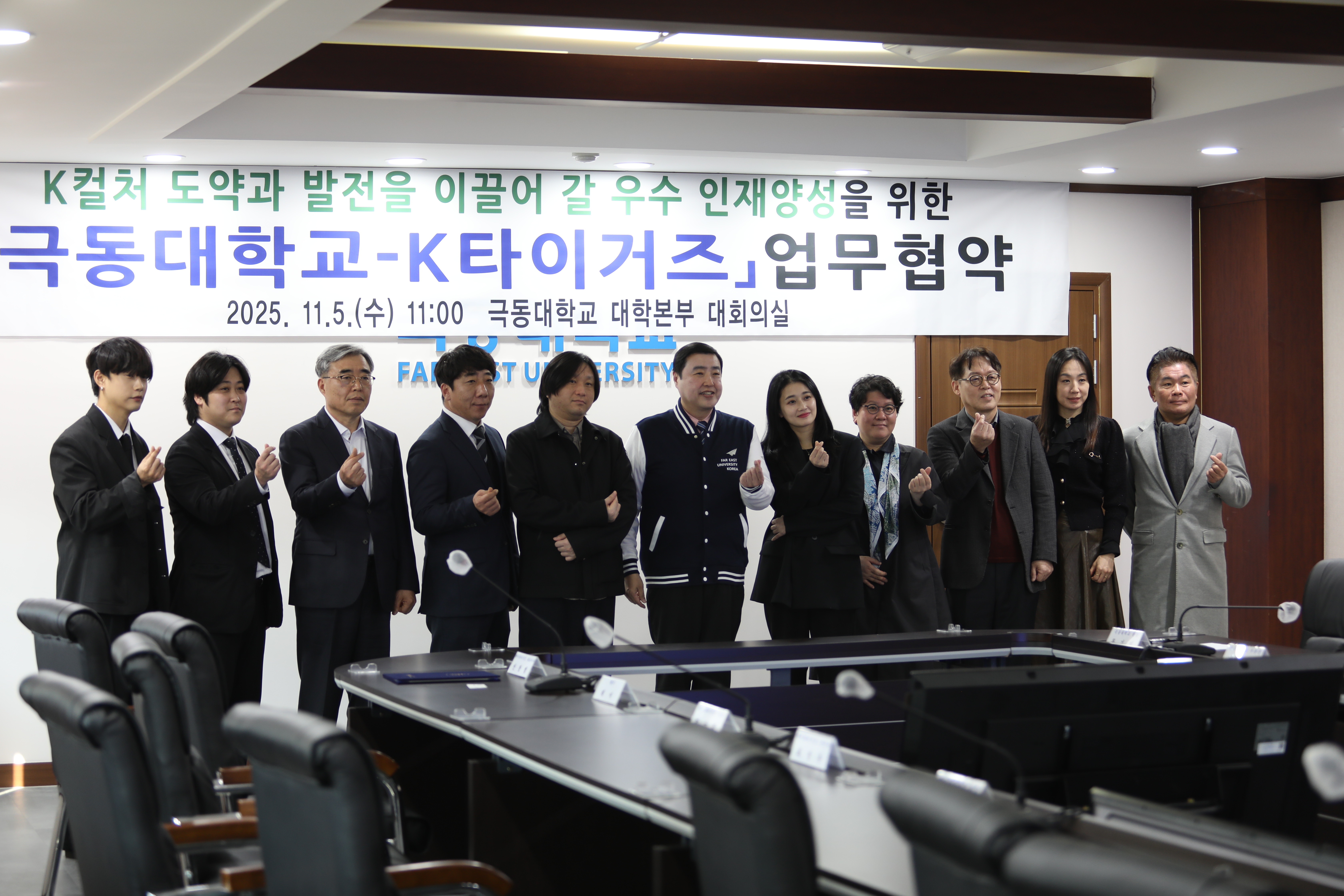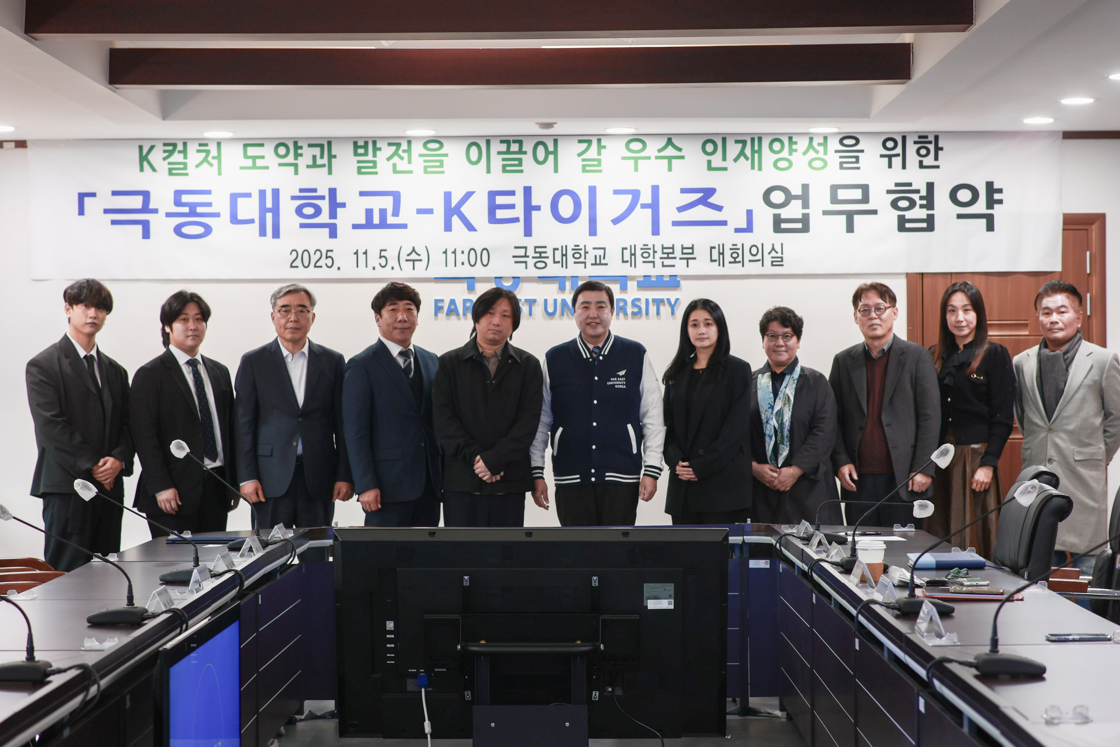 [음성, 2025년 11월 5일] — 극동대학교(총장 류기일)와 케이타이거즈 주식회사(대표이사 안창범)는 11월 5일 오전 11시, 극동대학교 대회의실에서 K-컬처의 글로벌 경쟁력 강화와 창의적 콘텐츠 인재 양성을 위한 산학협력협약을 체결했다.