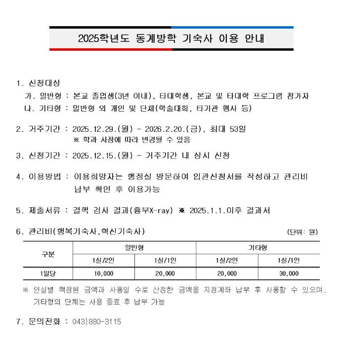 2025학년도 동계방학 행복기숙사 이용 안내 게시글 상세보기 - 작성자, 조회수, 등록일, 첨부파일, 상세내용, 이전글, 다음글 제공
