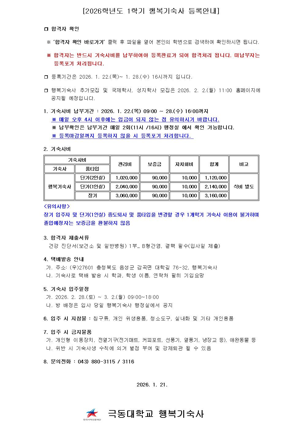 2026학년도 1학기 행복기숙사 합격자 등록 안내