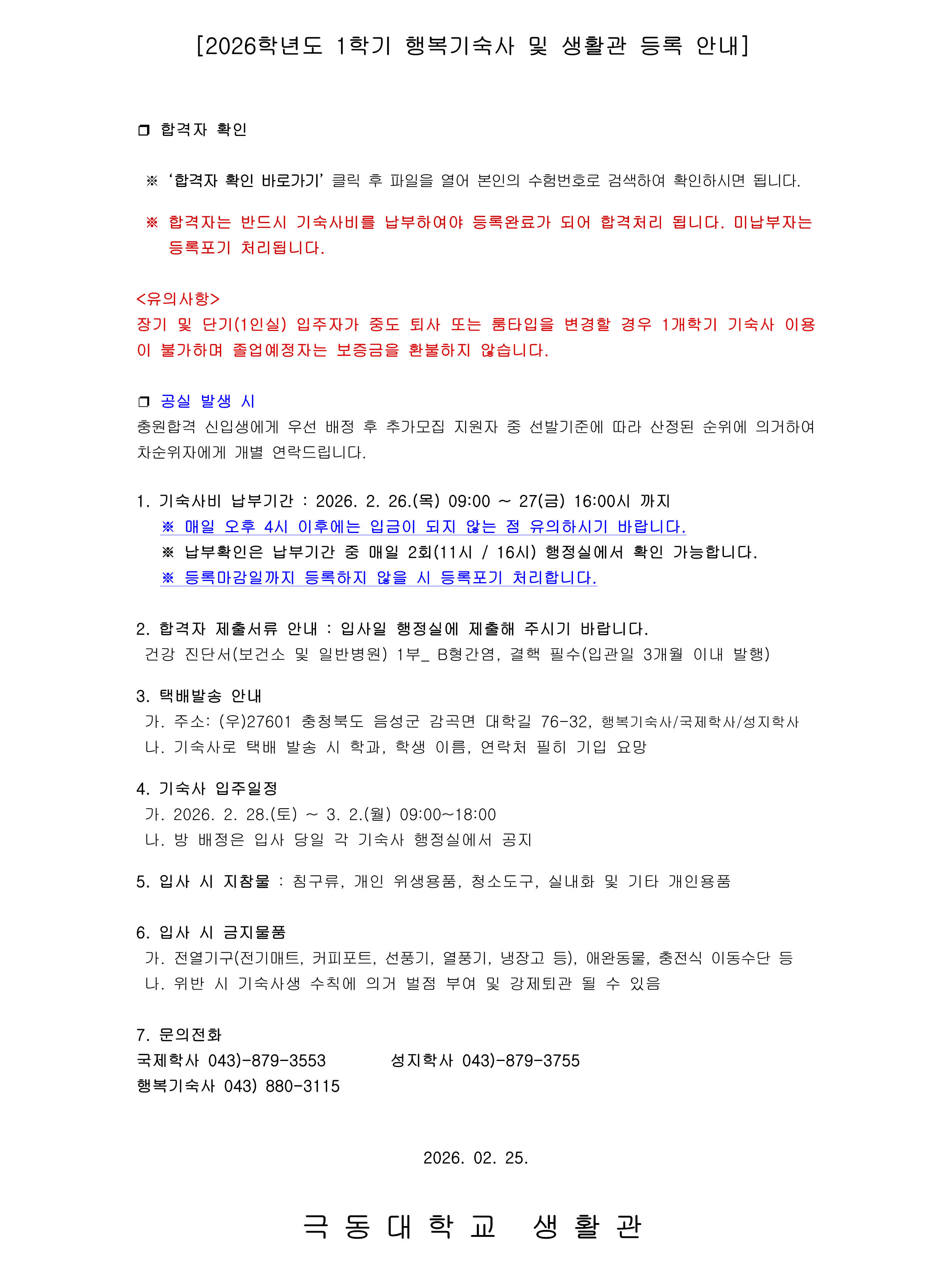 26학년도 1학기 기숙사 추가모집 합격자발표
