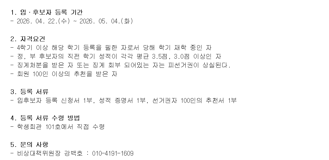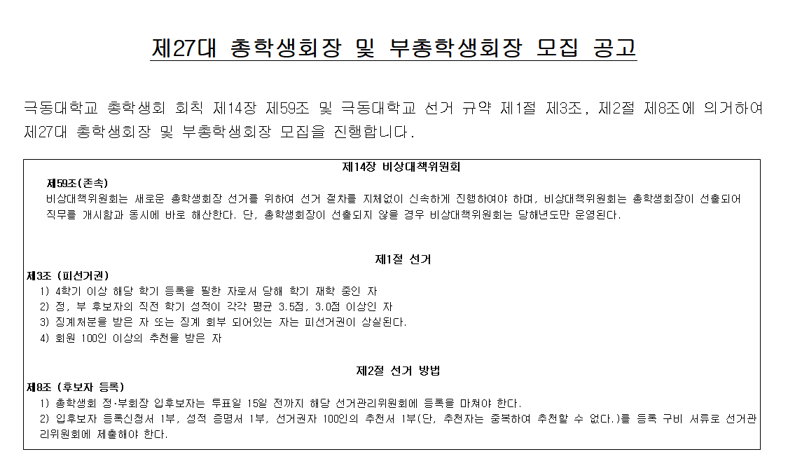 제27대 총학생회장 및 부총학생회장 모집 공고(입·후보자 등록 기간:- 2026. 04. 22.(수) ~ 2026. 05. 04.(화))