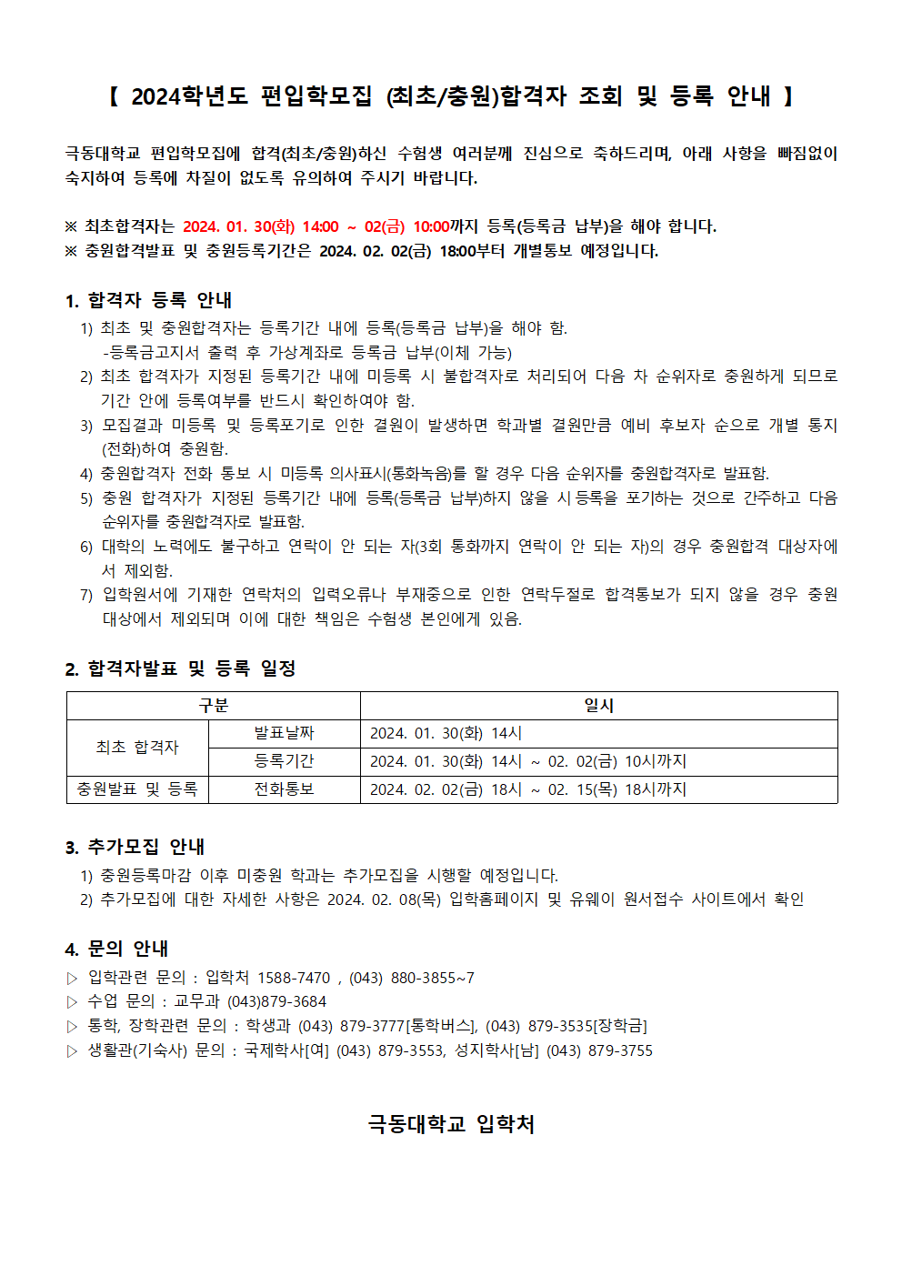2024학년도 편입학모집 (최초/충원)합격자조회 및 등록 안내