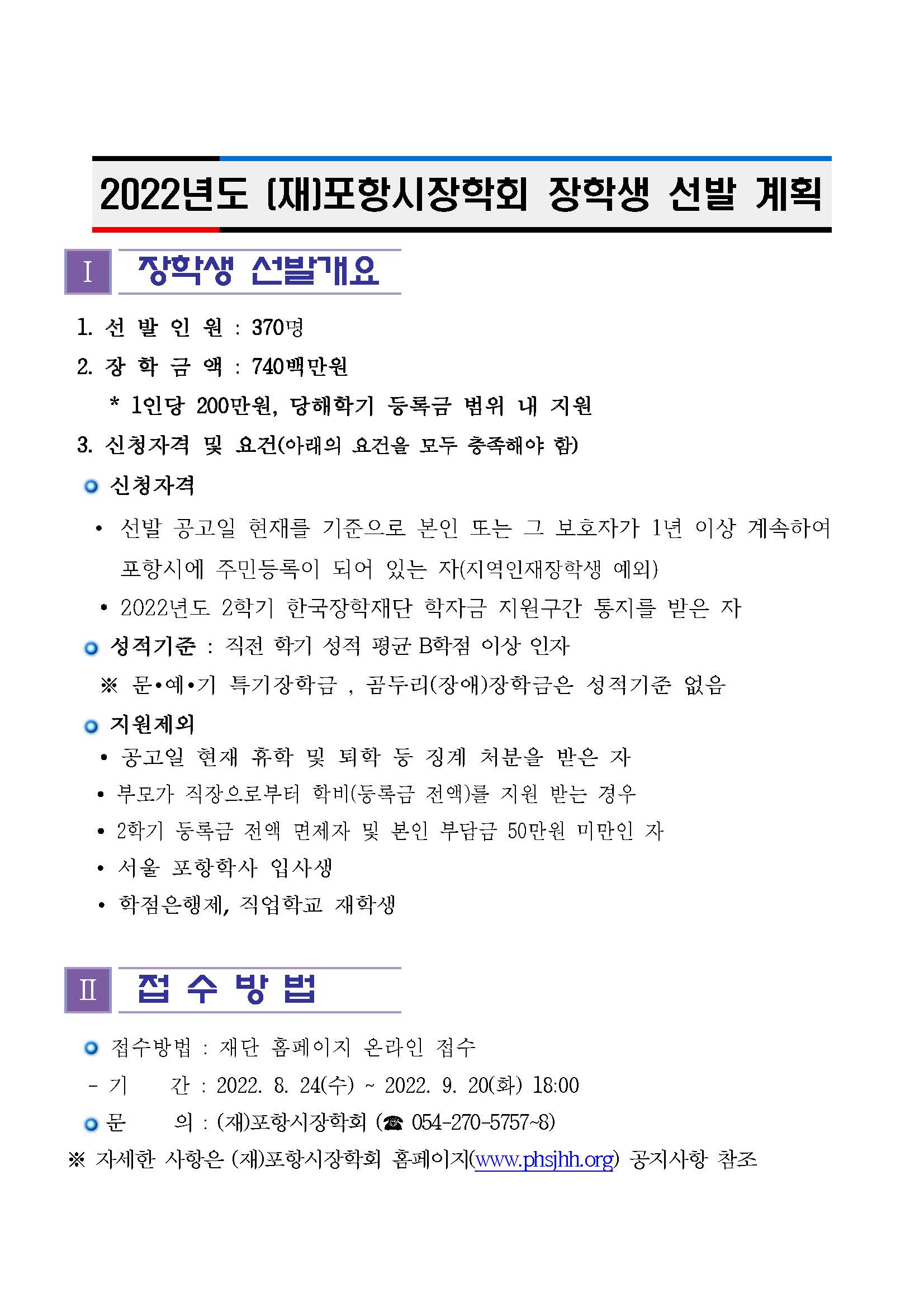 포항시장학회에서는 포항 출신 대학생 중 학업성적이 우수하고 재능이 뛰어난 학생들에게 학비의 일부를 지원하고 있습니다. 이에 따라 2022년도 포항시장학생을 아래와 같이 선발하오니 해당하는 학생들의 많은 신청 바랍니다.