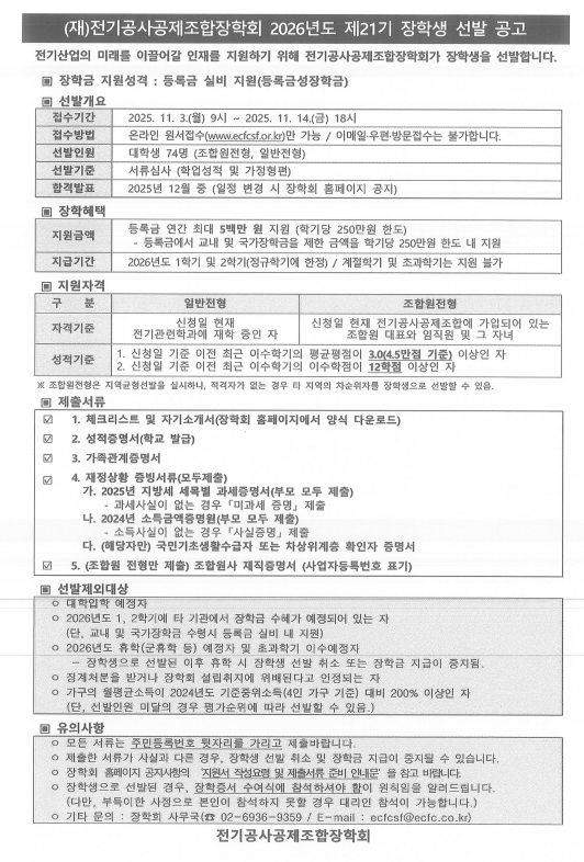 [전기공사공제조합장학회] 2026년 전기공사공제조합장학회 제21기 장학생 선발 안내 *신청기한: ~2025.11.14(금) 18시까지