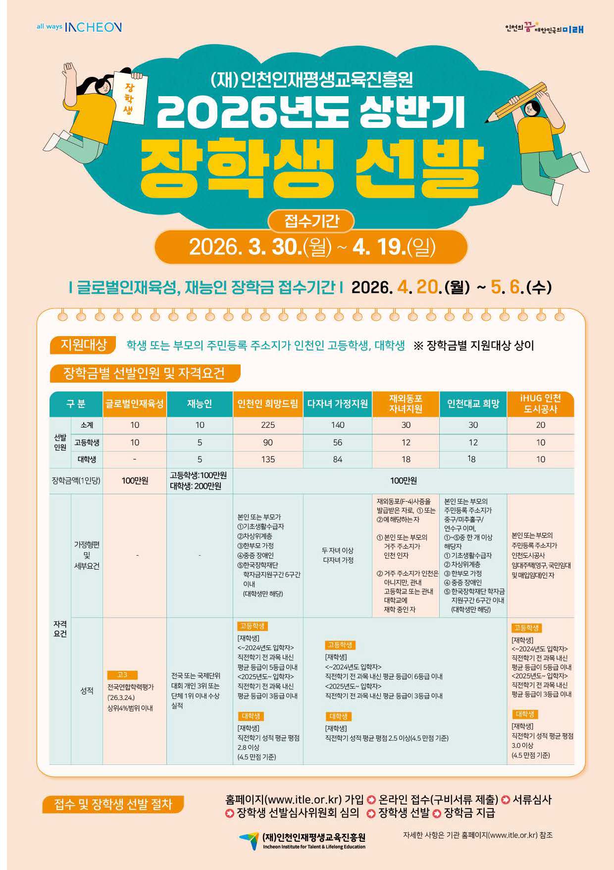 - 재능인, 인천인희망드림, 다자녀가정지원, 재외동포장녀지원, 인천대교희망, iHUG인천도시공사 장학금