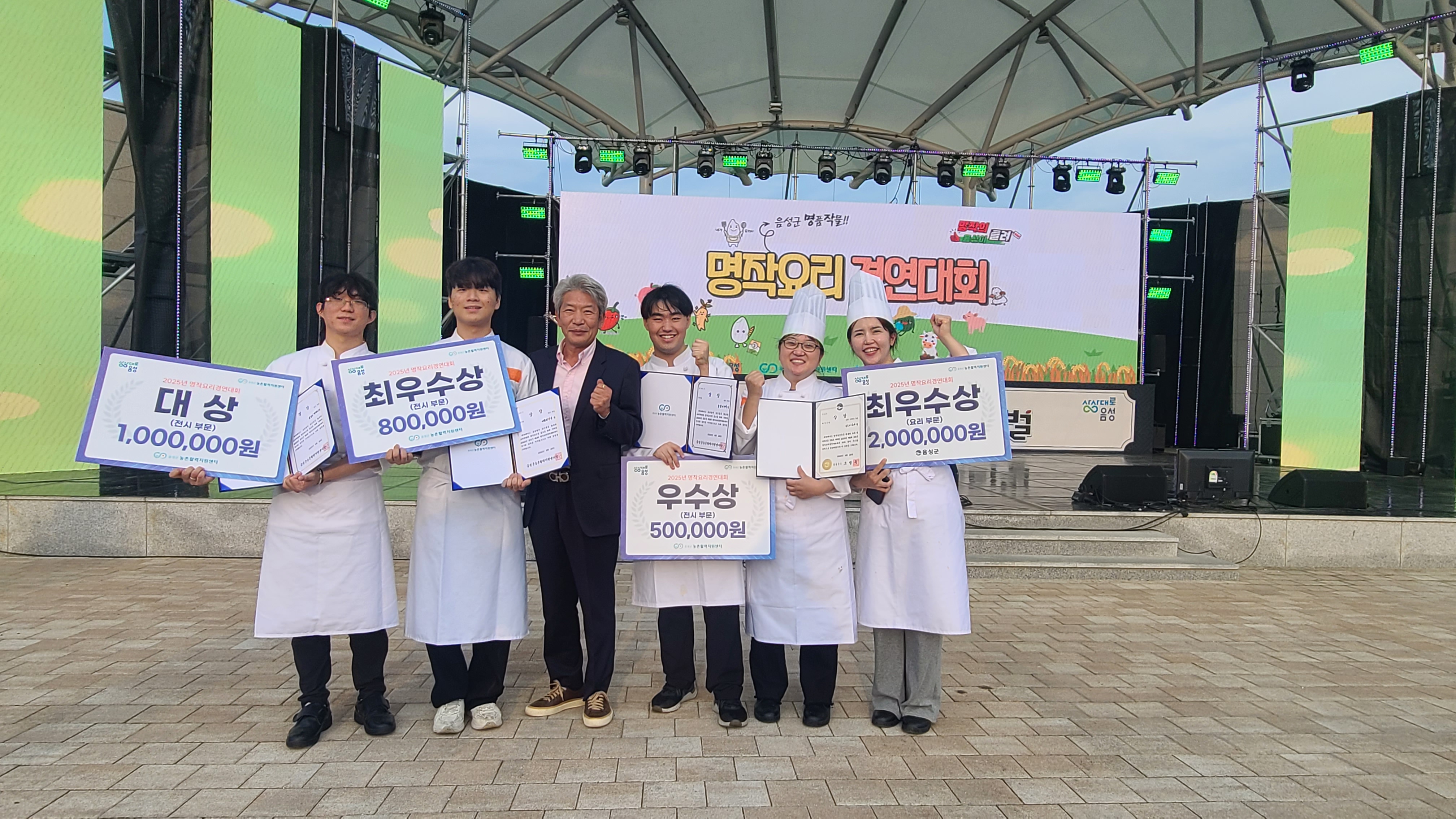 충북 음성군에서 개최된 ‘제2회 음성명작요리경연대회’에서 극동대학교 호텔외식조리학과 학생들이 요리경연 및 전시경연 부문에서 다수의 상을 수상하고 관계자들과 함께 기념촬영을 하고 있다.