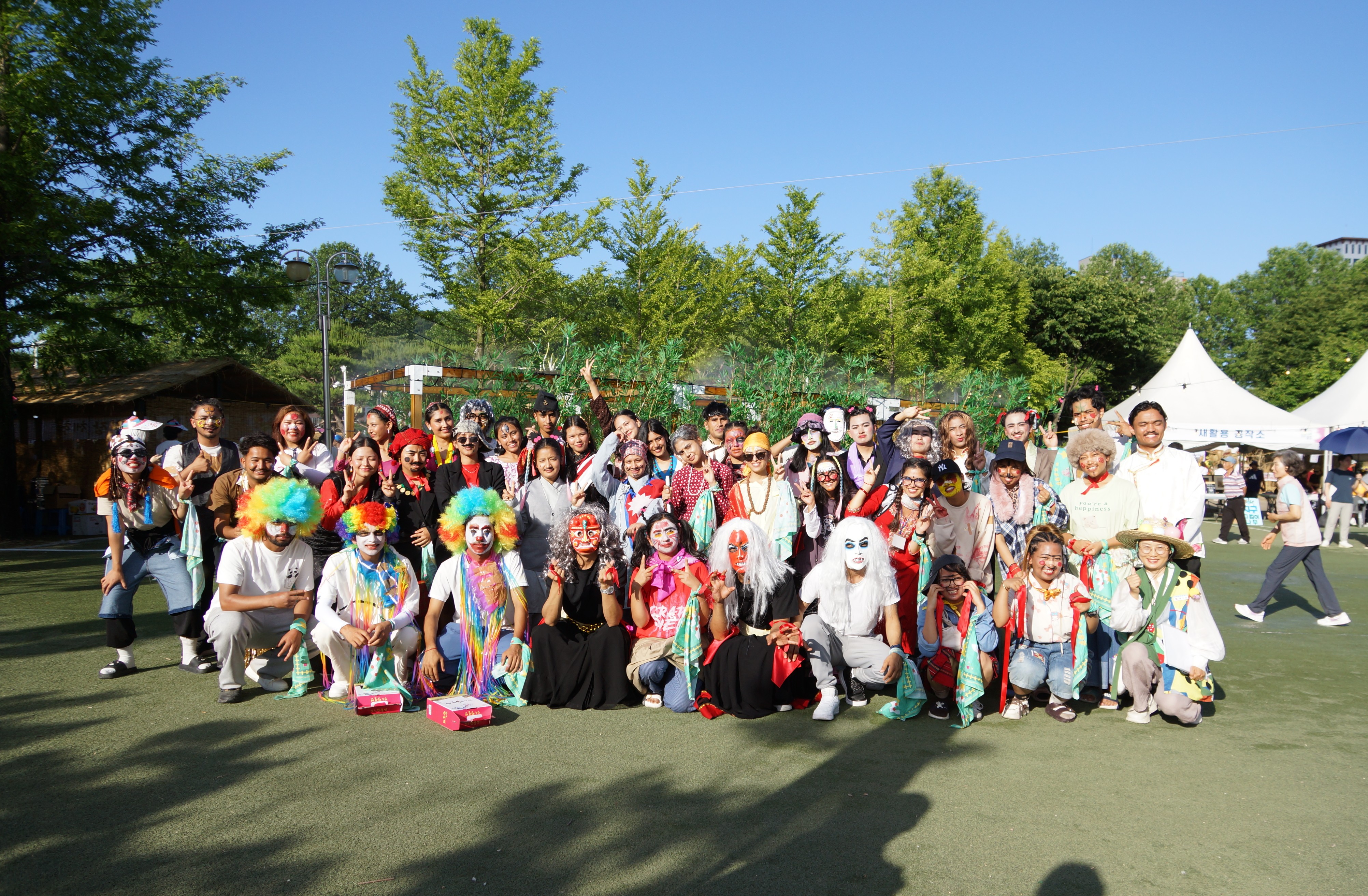 ▲ 극동대학교 외국인 유학생들이 충북 음성에서 열린 '품바축제'에 참가해 전통 분장을 하고 기념촬영을 하고 있다. 극동대는 한국어 및 한국문화 교육을 통해 유학생의 지역사회 참여를 적극 지원하고 있다.