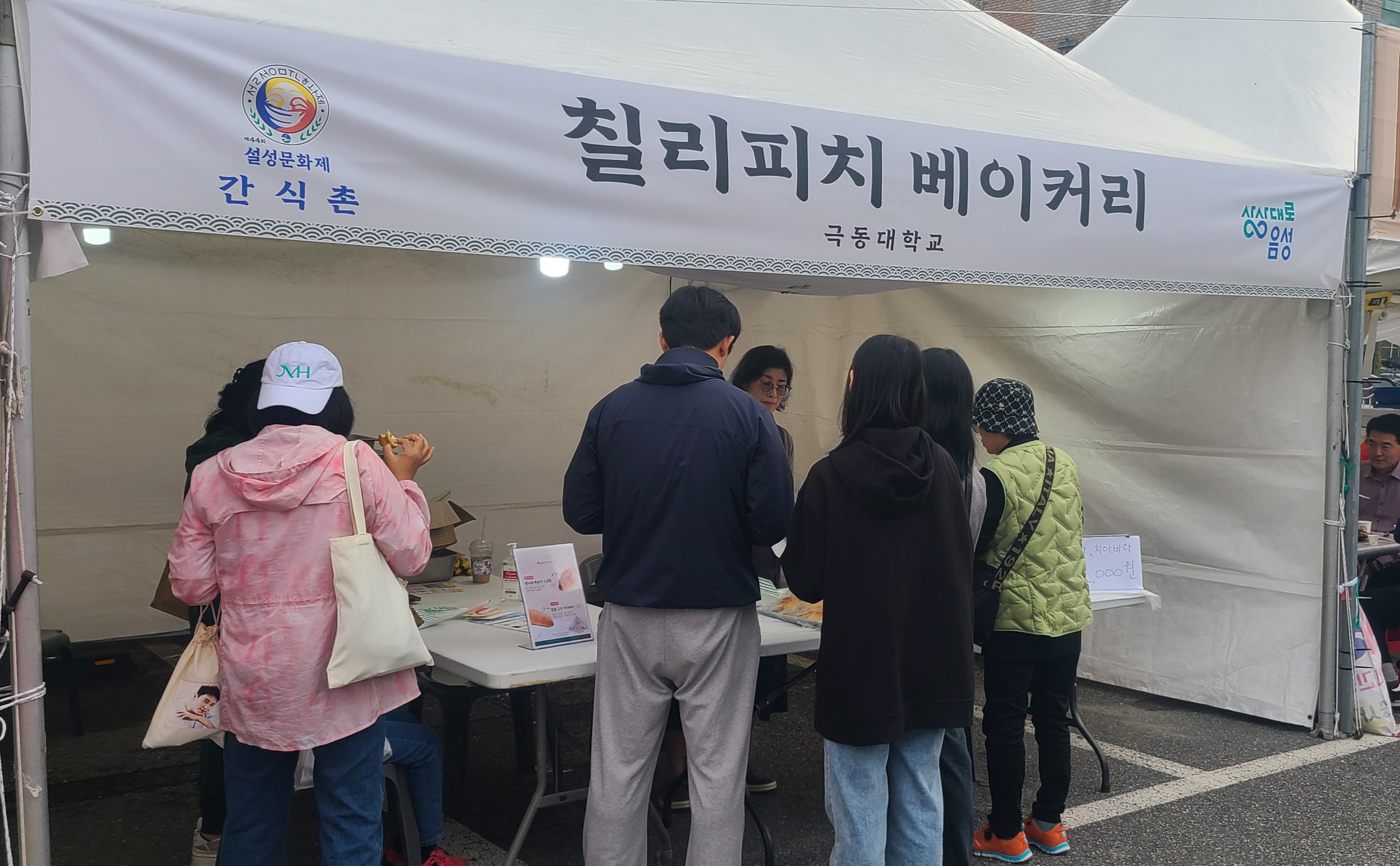 ▲ 제44회 설성문화제 현장에 마련된 ‘칠리피치 베이커리’ 부스에서 방문객들이 극동대학교 학생들이 만든 복숭아소금빵과 고추 치아바타를 시식하고 있다.