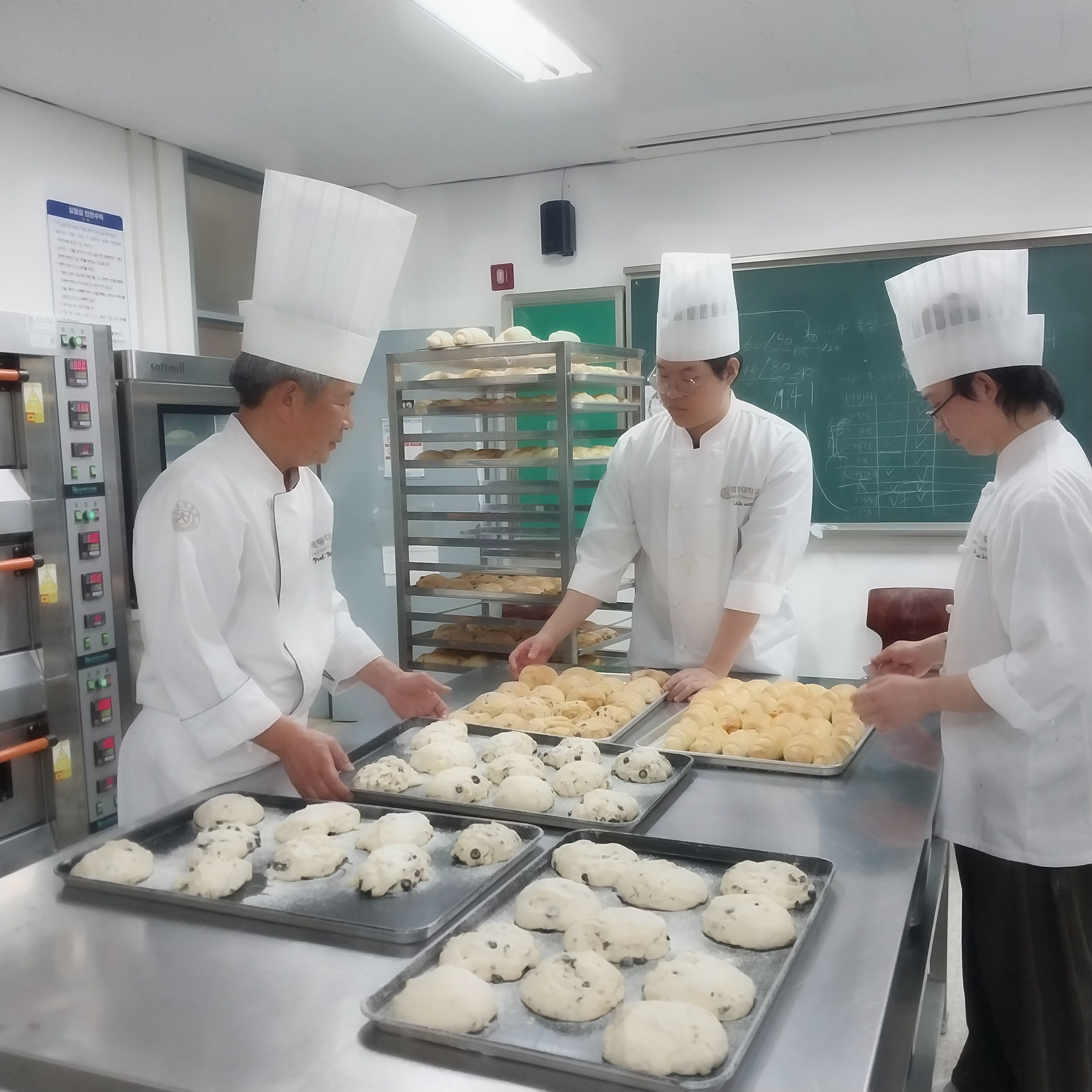 ▲극동대학교 호텔외식조리학과 교수와 학생들이 지역 농산물을 활용한 창의 베이커리 제품 개발을 위해 실습실에서 빵을 만들고 있다. |