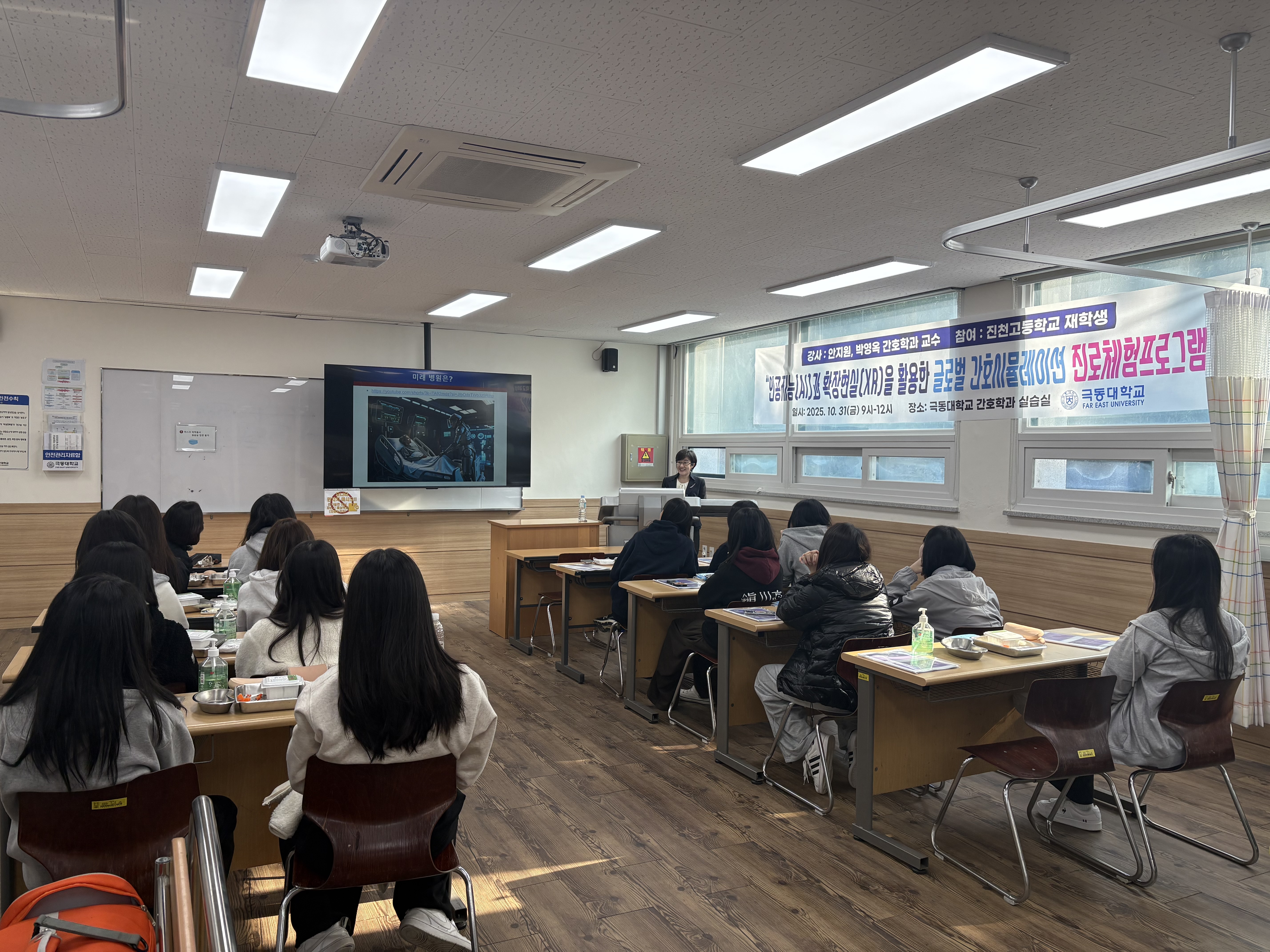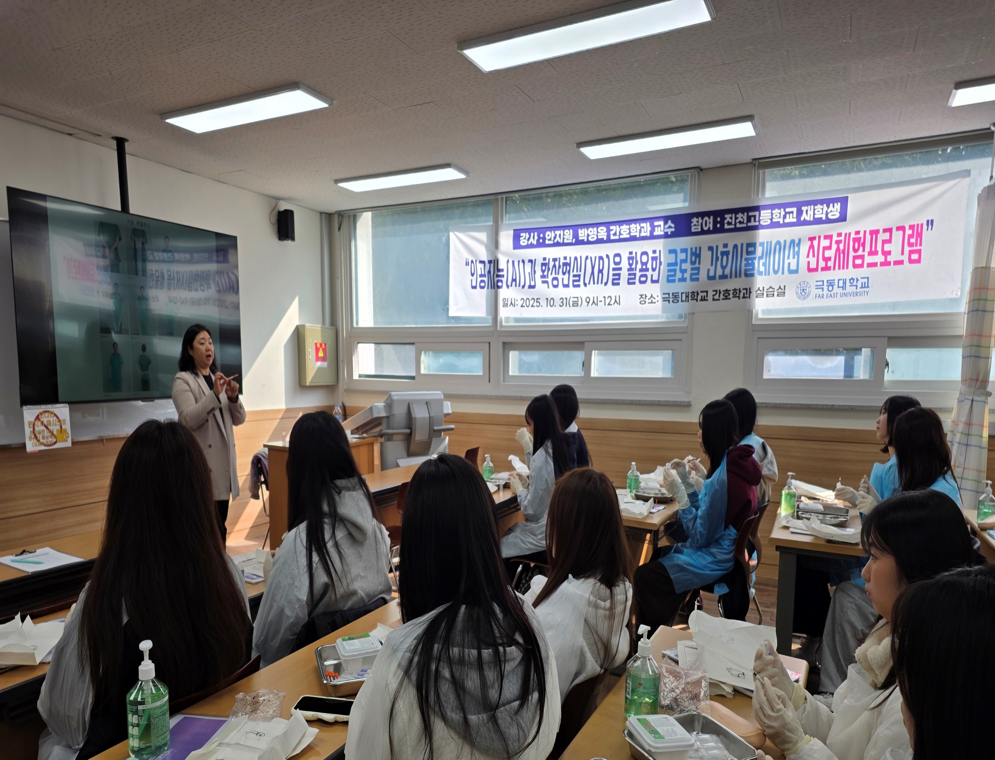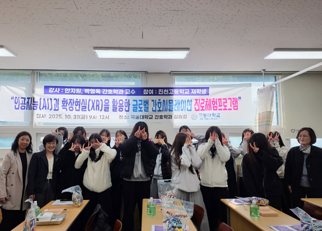 이날 프로그램에서는 간호학과 안지원 교수와 박영옥 교수가 ‘인공지능(AI)과 확장현실(XR)을 활용한 글로벌 간호 시뮬레이션’을 주제로 특강 및 실습을 진행했다. 참여 학생들은 감염예방 실습, 주사 시뮬레이션 체험, AI·XR 기반 시뮬레이션 수업 참관 등을 통해 최신 간호 교육의 실제 적용 사례를 생생하게 경험했다.