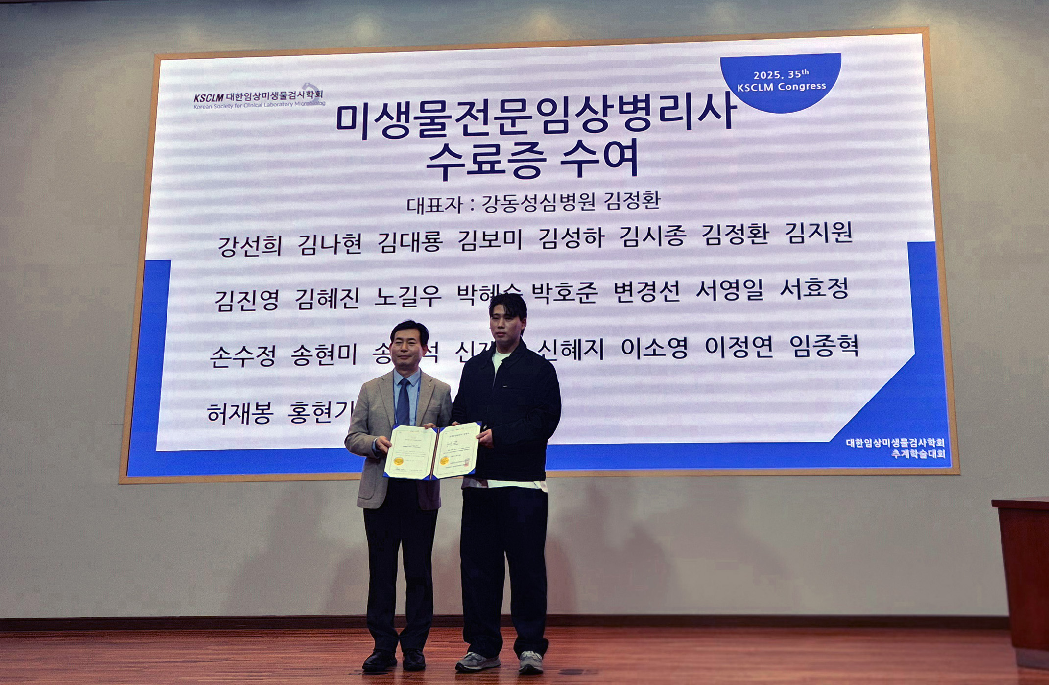 ▲ 2025년 대한임상미생물검사학회 추계학술대회에서 김정환 졸업생(오른쪽)이 미생물 전문임상병리사 자격시험 수석 합격자로 대표 수료증을 수여받고 있다.