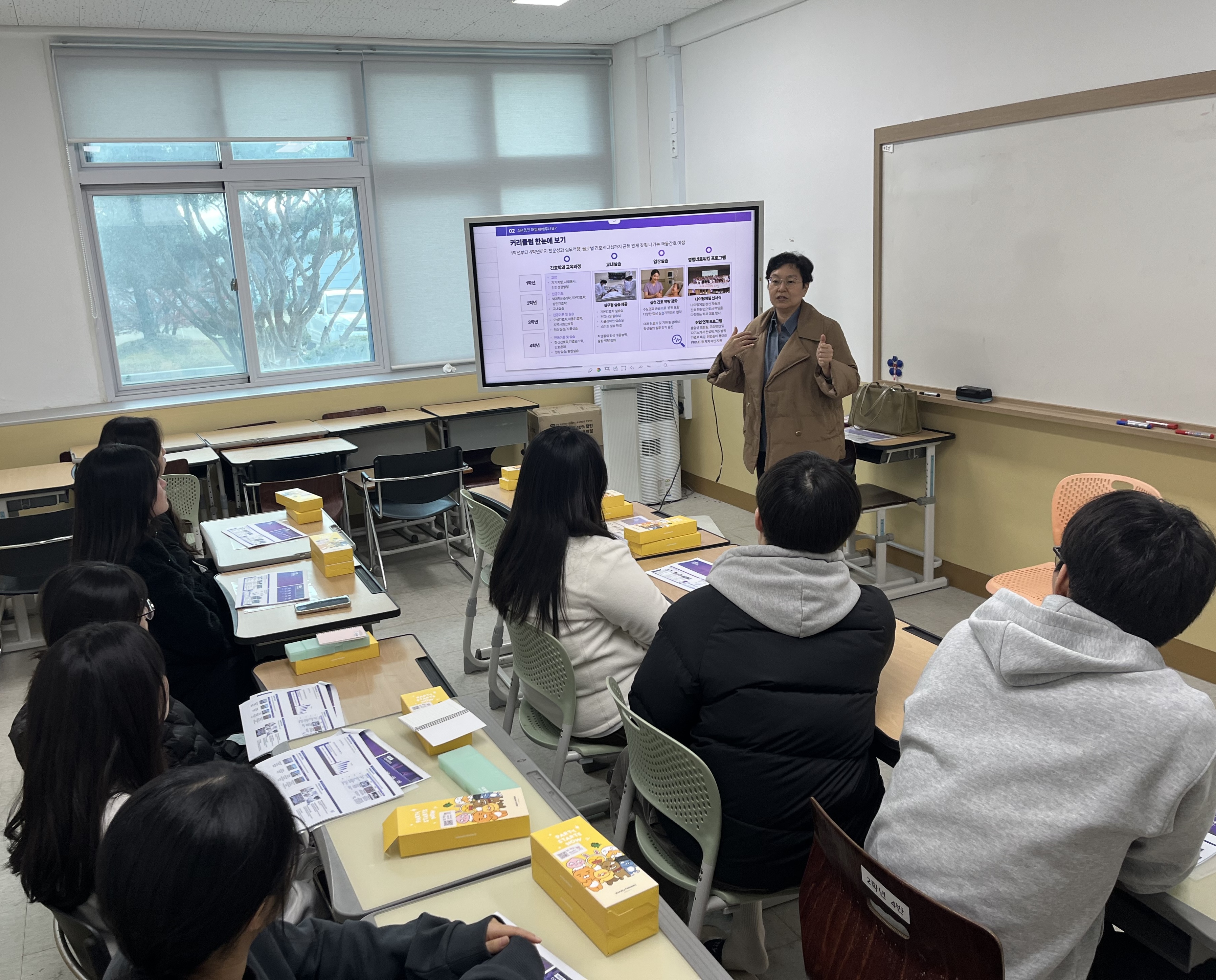 ▲ 극동대학교 구본진 의료보건과학대학장이 음성고등학교 학생들을 대상으로 AI 기반 간호교육 콘텐츠 및 진로 정보를 설명하고 있다.
