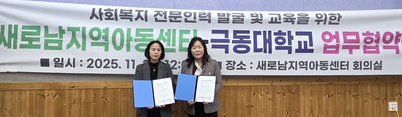 ▲ 극동대학교 사회복지학과와 새로남지역아동센터가 업무협약을 체결하고 기념 촬영을 하고 있다. (왼쪽부터) 새로남지역아동센터 백인호 센터장, 극동대학교 임은의 교수.