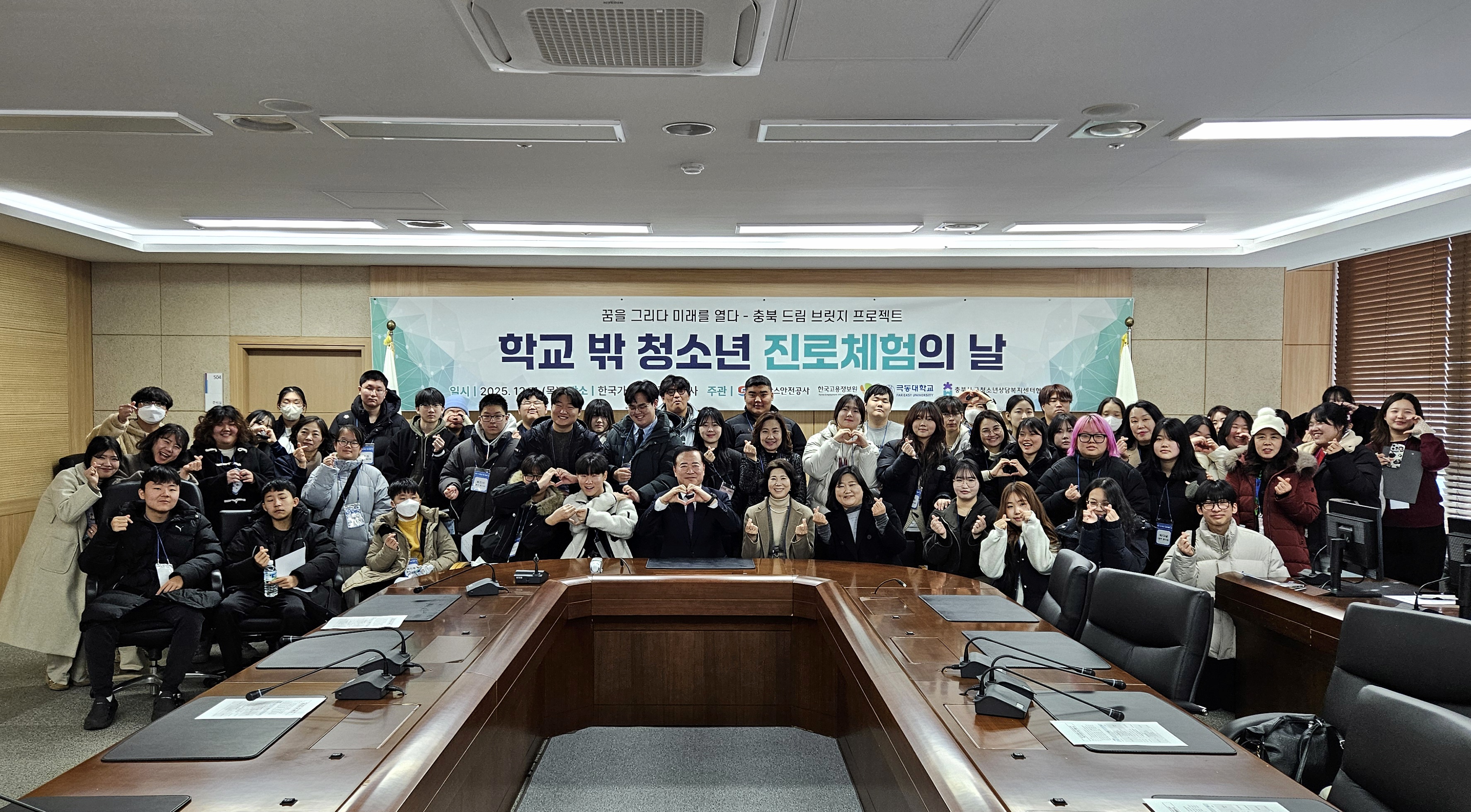 ▲ 12월 4일 충북혁신도시에서 열린 ‘충북 드림브릿지 진로·체험의 날’ 행사에 참가한 학교 밖 청소년 및 관계자들이 한국가스안전공사 회의실에서 기념촬영을 하고 있다. 이번 프로그램은 한국가스안전공사, 한국고용정보원, 극동대학교가 함께 기획·운영하며, 청소년들이 다양한 진로를 탐색하고 공공기관의 역할을 직접 체험할 수 있는 기회를 제공했다