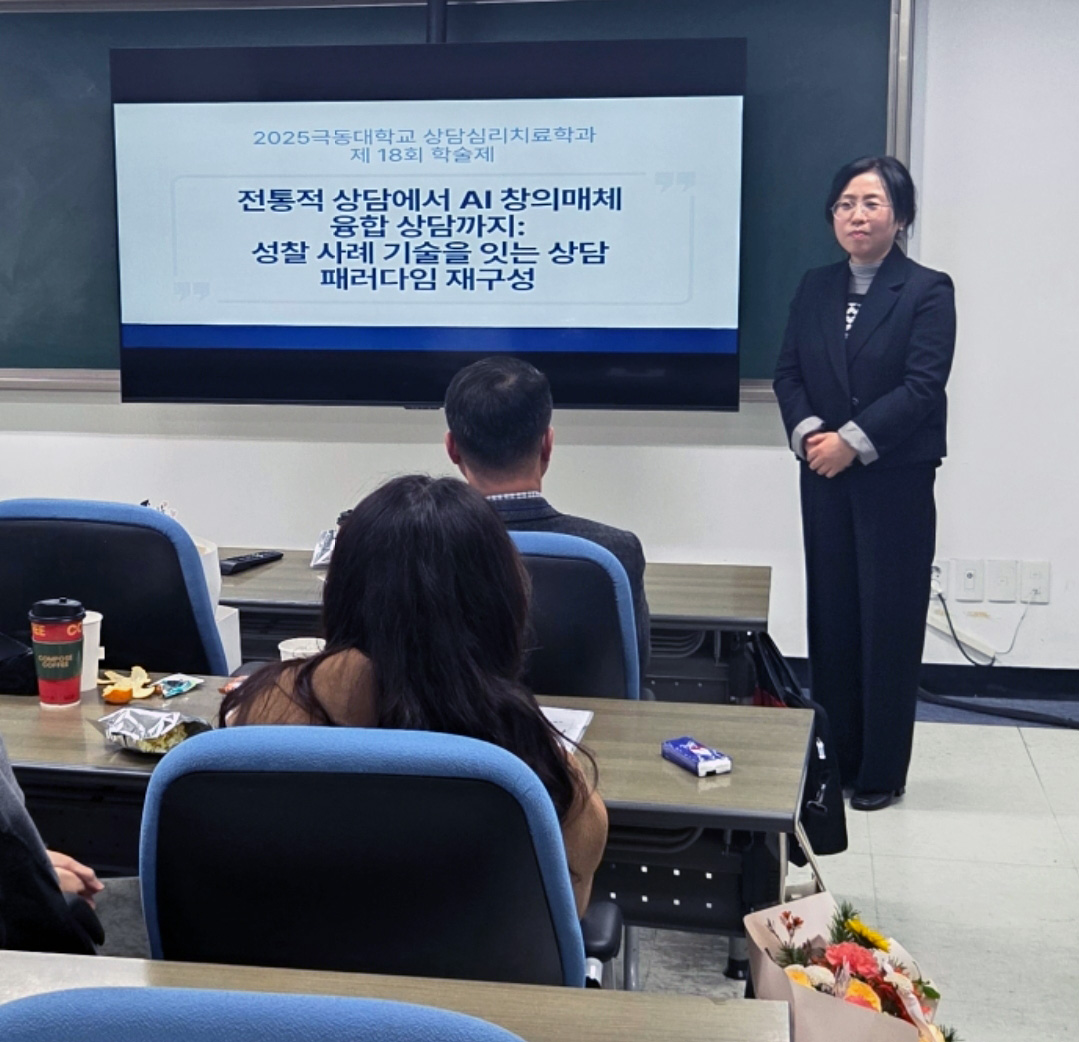▲ 극동대학교 공학관 204호에서 진행된 제18회 학술제에서 한 발표자가 ‘상담자의 자기성찰과 AI 융합 기법’에 대해 발표하고 있다. 현장에서는 청소년·가족 정신건강을 위한 상담자의 역할과 기술적 접근에 대한 활발한 논의가 이뤄졌다.