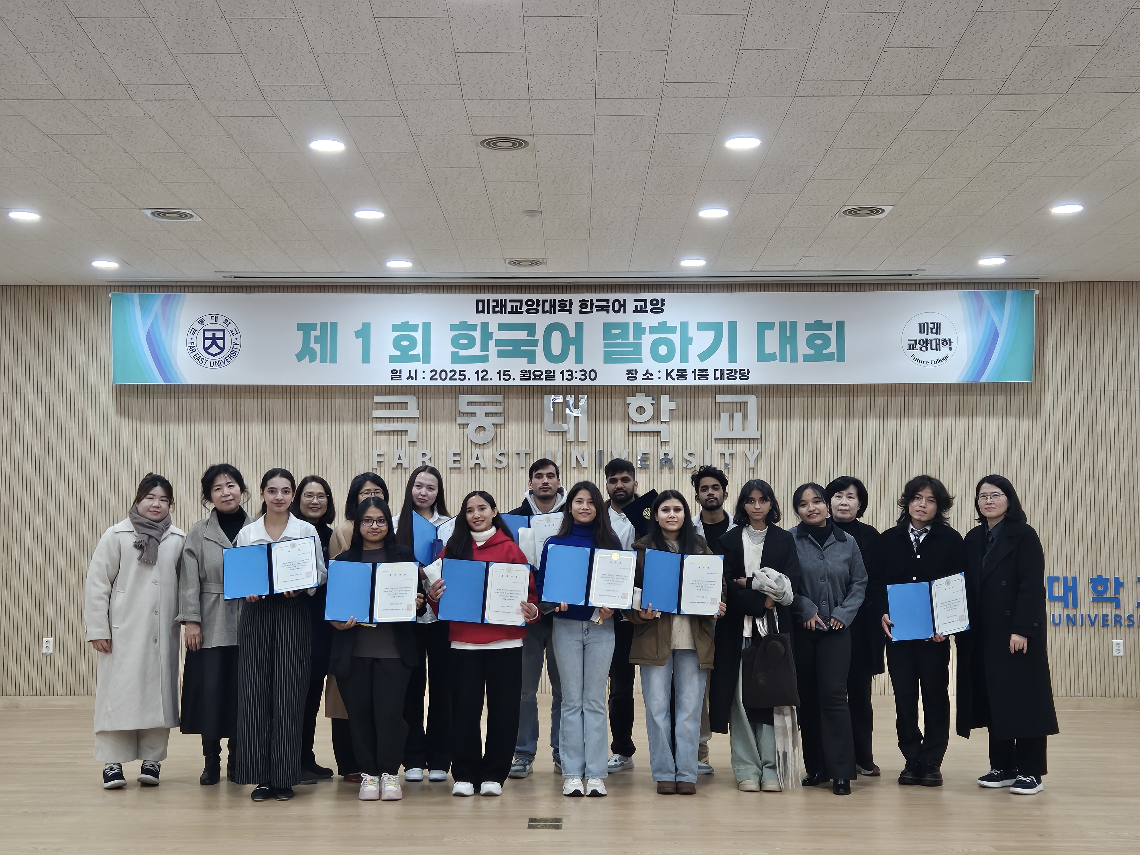 ▲ 극동대학교 미래교양대학이 2025년 12월 15일 교내 K동 1층 대강당에서 개최한 ‘제1회 한국어 말하기 대회’에서 수상자와 관계자들이 기념촬영을 하고 있다. 이번 대회는 외국인 유학생들이 한국어 학습 성과를 발표하며 한국 문화와 모국 문화를 비교하는 형식으로 진행됐다.