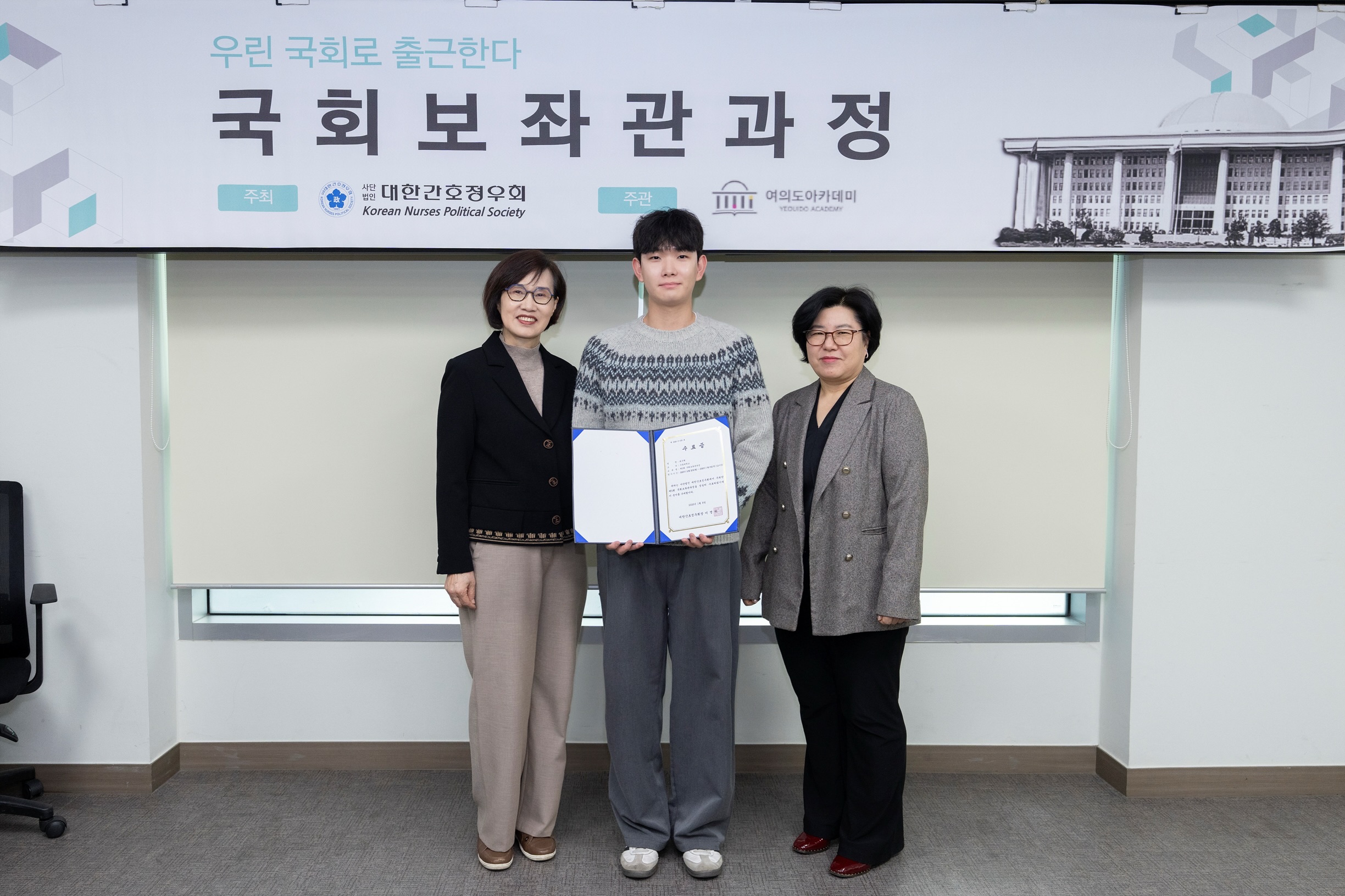 ▲ 극동대학교 간호학과 최우혁(가운데) 학생이 ‘제5회 국회보좌관과정’ 수료식에서 수료증을 받은 후 관계자들과 기념촬영을 하고 있다.