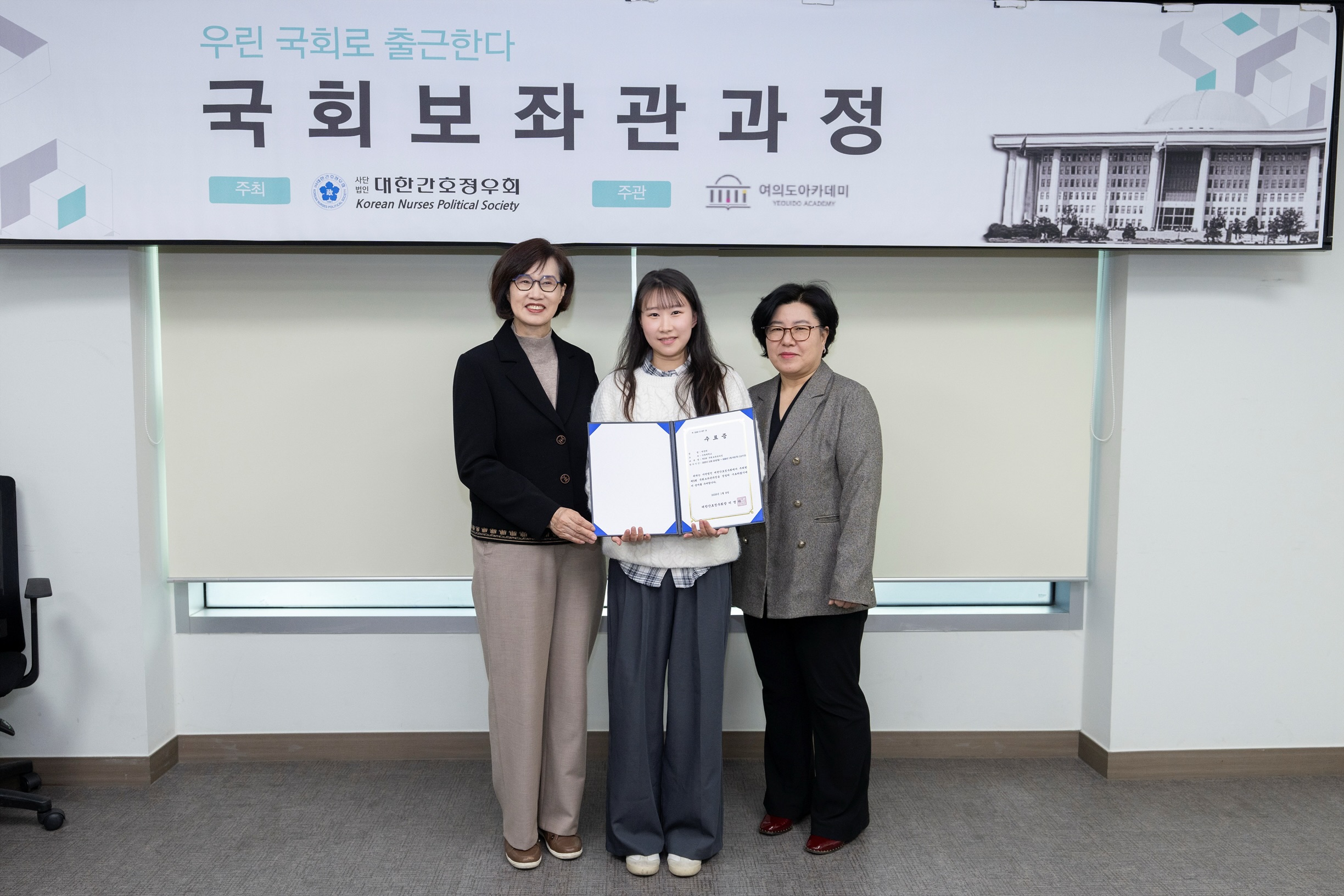 ▲ 극동대학교 간호학과 박경리(가운데) 학생이 ‘제5회 국회보좌관과정’ 수료식에서 수료증을 받은 후 관계자들과 기념촬영을 하고 있다.