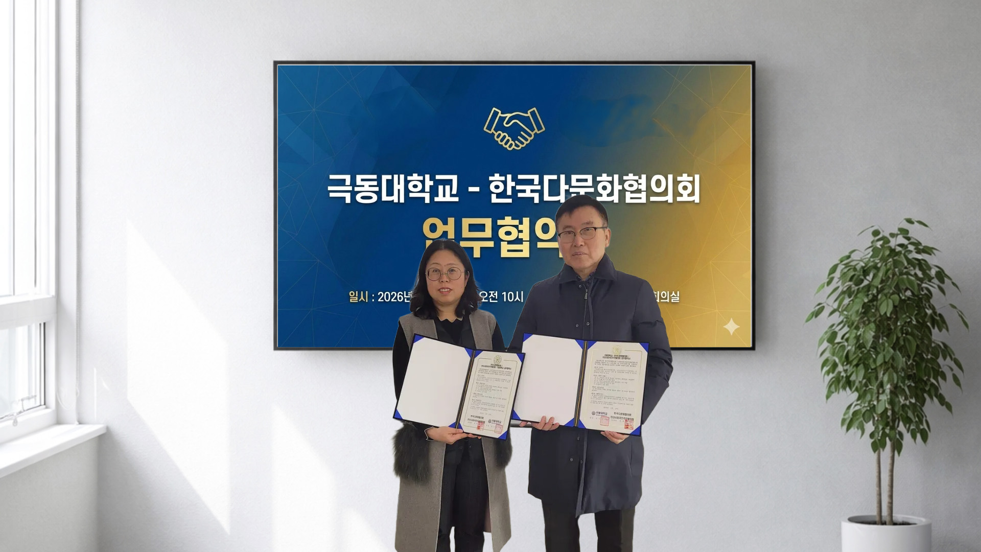 ▲ 안산시 외국인 주민협의회 최연화 상임대표(왼쪽)와 극동대학교 임광혁 미래학습지원센터장(오른쪽)이 업무협약서를 들고 기념촬영을 하고 있다. |