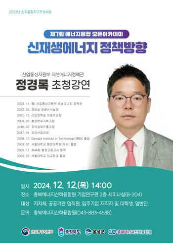 충북에너지산학융합원, 12일 산업부 정경록 재생에너지정책관 초청강연