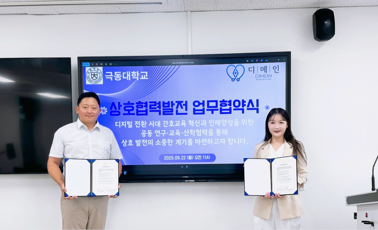 □ 극동대학교 간호학과가 ㈜디메인과 손잡고 디지털 헬스케어·AI 기반 간호교육 연구 및 인재 양성을 위한 산학협력 업무협약(MOU)을 체결했다.