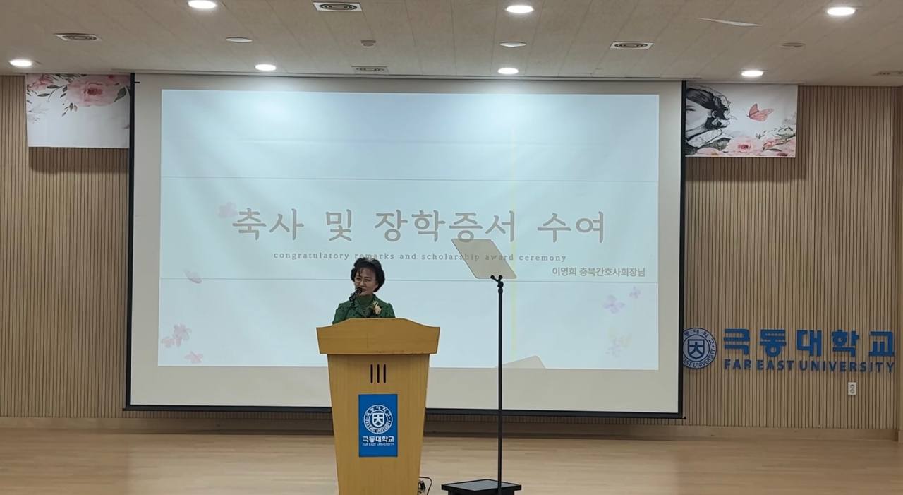 □ 이명희 충북간호사회 회장은 “후배 간호사들이 현장에서 전문성과 따뜻한 마음을 함께 갖춘 간호인으로 성장하길 바랍니다. 충북간호사회는 여러분의 성장을 늘 응원하겠습니다.” 라고 전하며, 심민솔 대표 학생에게 충북간호사회 간호장학생 장학증서와 장학금을 수여했다.