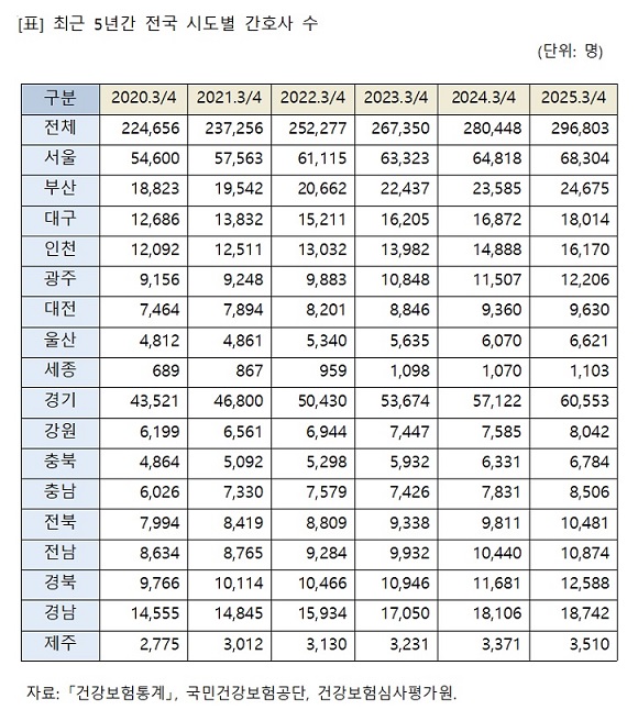 7일 건강보험통계에 따르면 전국 간호사 수는 2020년 9월 말 22만4656명에서 2025년 9월 말 29만6803명으로 7만2147명 증가했다. 양적 성장은 이뤄졌으나 내용을 들여다보면 ‘수도권 쏠림’ 현상이 뚜렷했다.