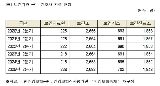 ‘보건기관 근무 간호사 인력 현황’ 자료에 따르면 2020년 2분기 2656명이었던 전국 보건소 간호사는 2025년 2분기 기준 2682명으로 집계됐다. 5년 동안 늘어난 인력은 단 26명으로, 증가율은 1.0%에 불과했다.