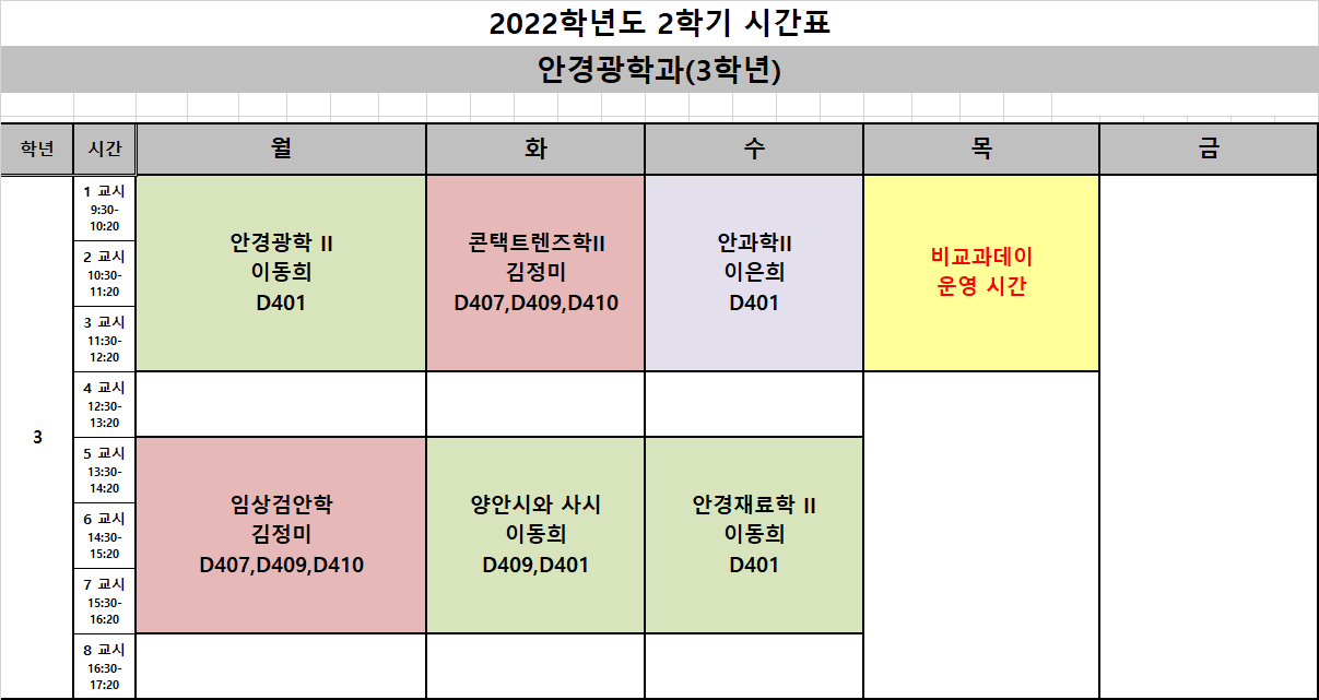 2022학년도 2학기 안경광학과 시간표