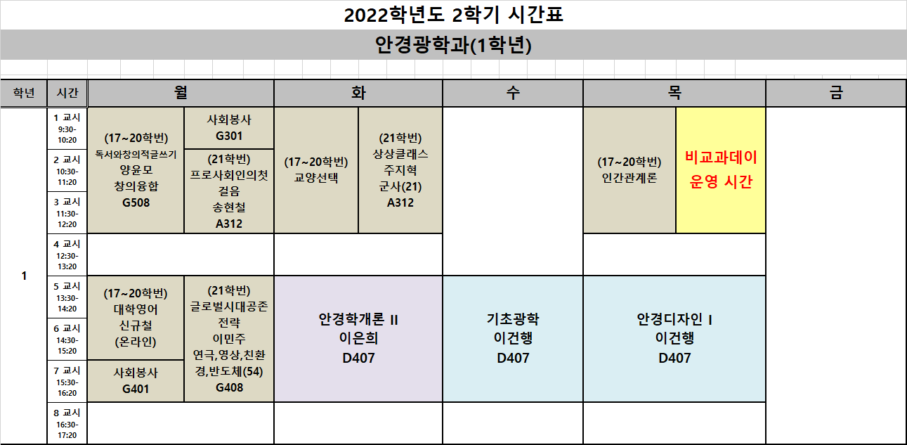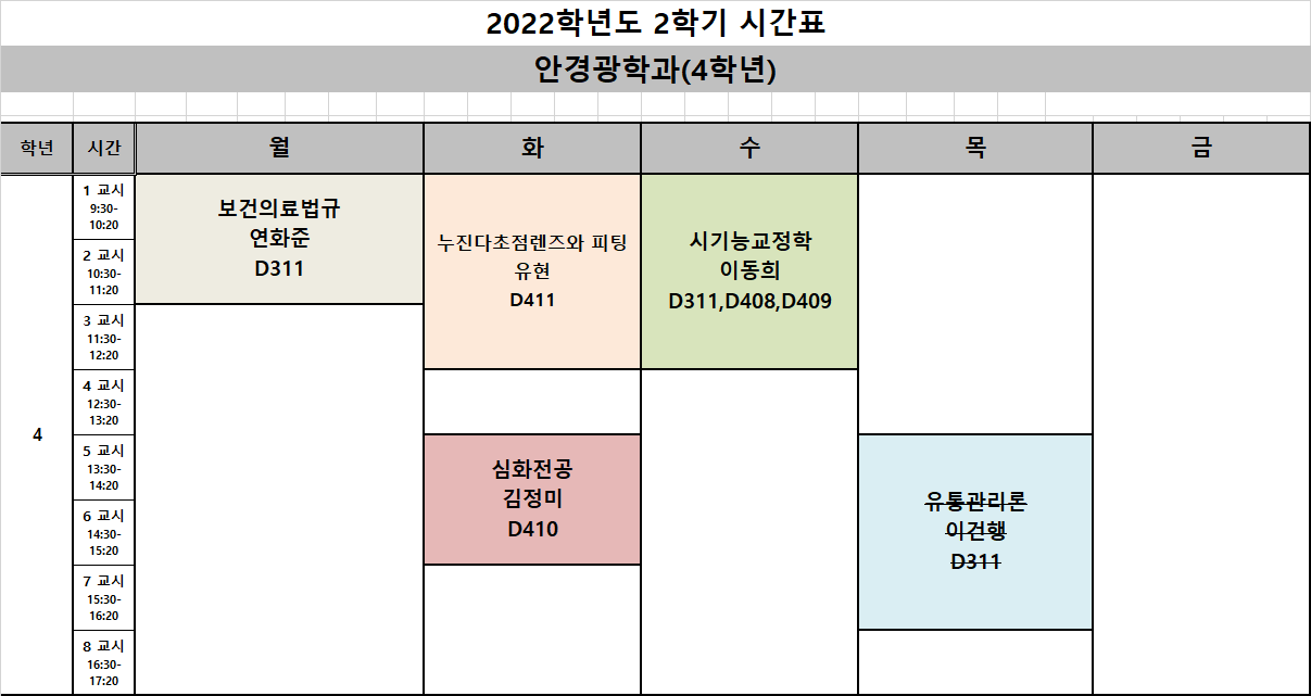 2023학년도 1학기 안경광학과 시간표