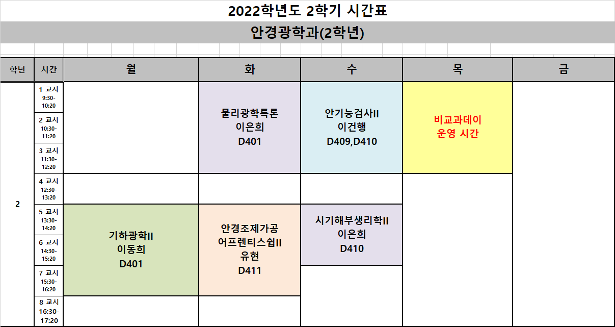 2022학년도 2학기 안경광학과 시간표 입니다.