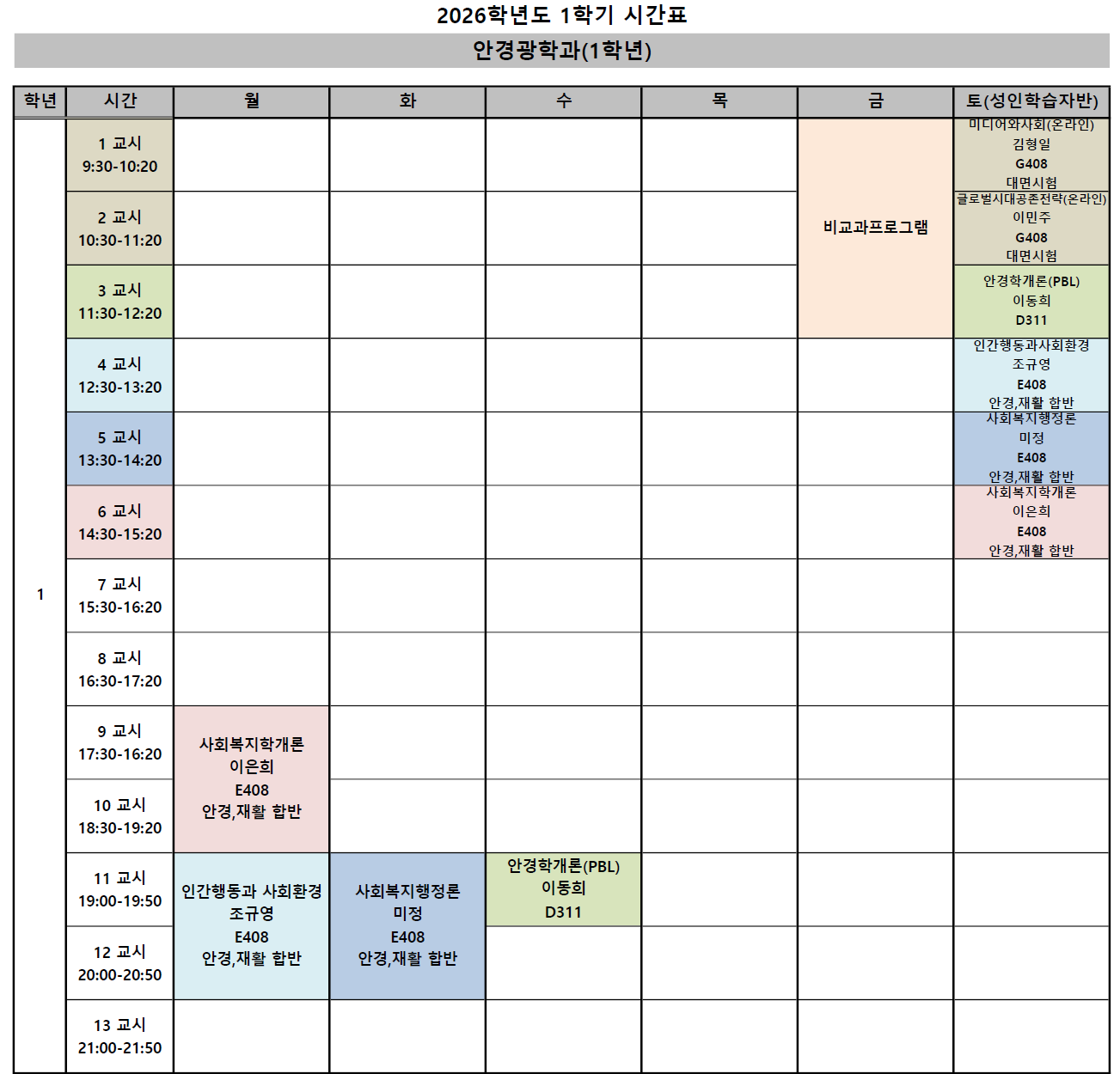 2026학년도 1학기 안경광학과 시간표