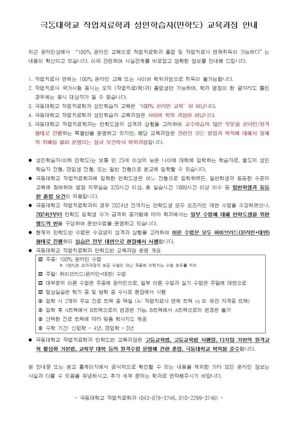 극동대학교 작업치료학과 성인학습자 교육과정 안내