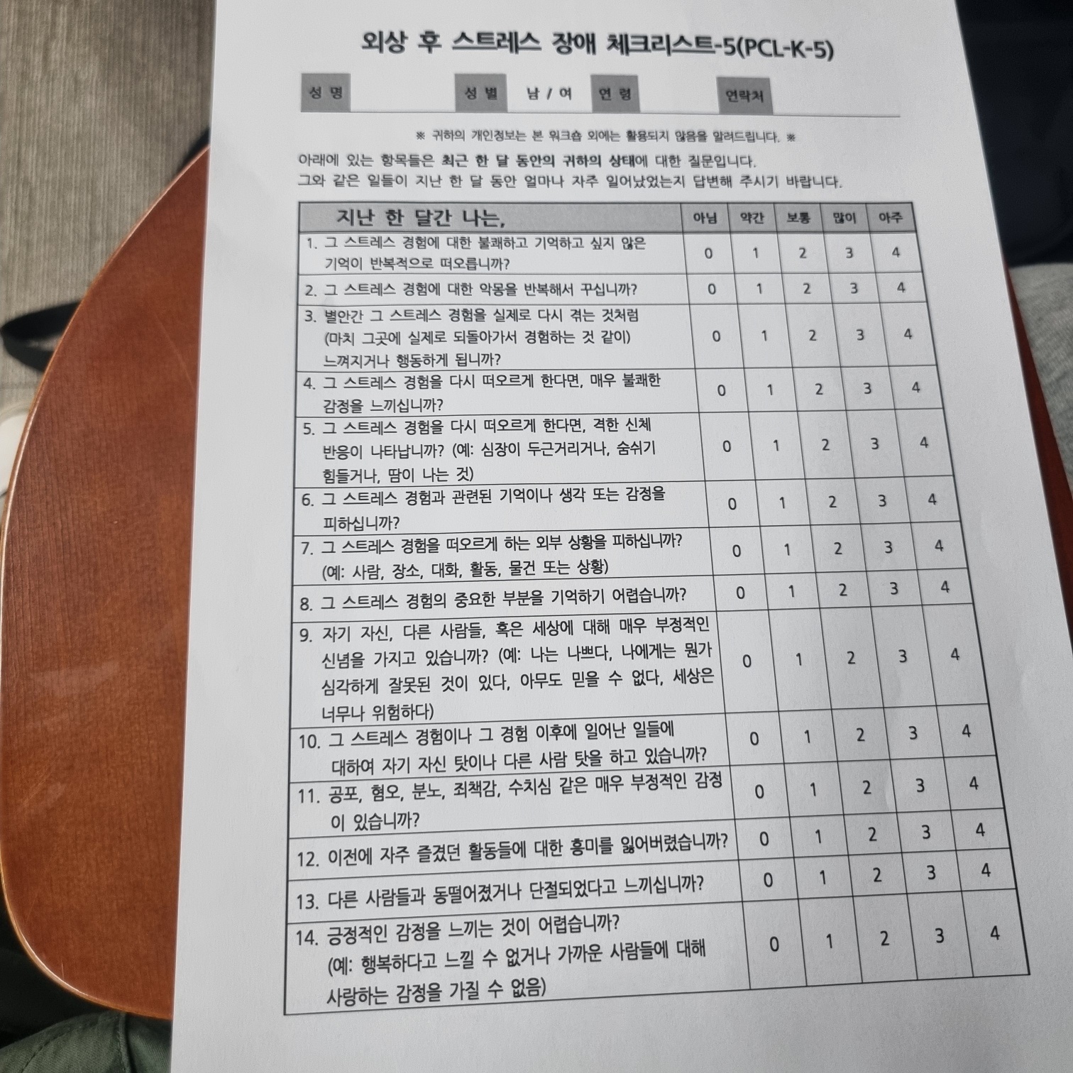 외상 후 스트레스 장애 검사지인 PCL-K-5 검사지도 직접 해보고