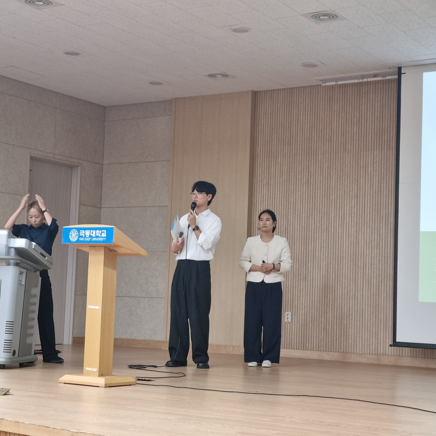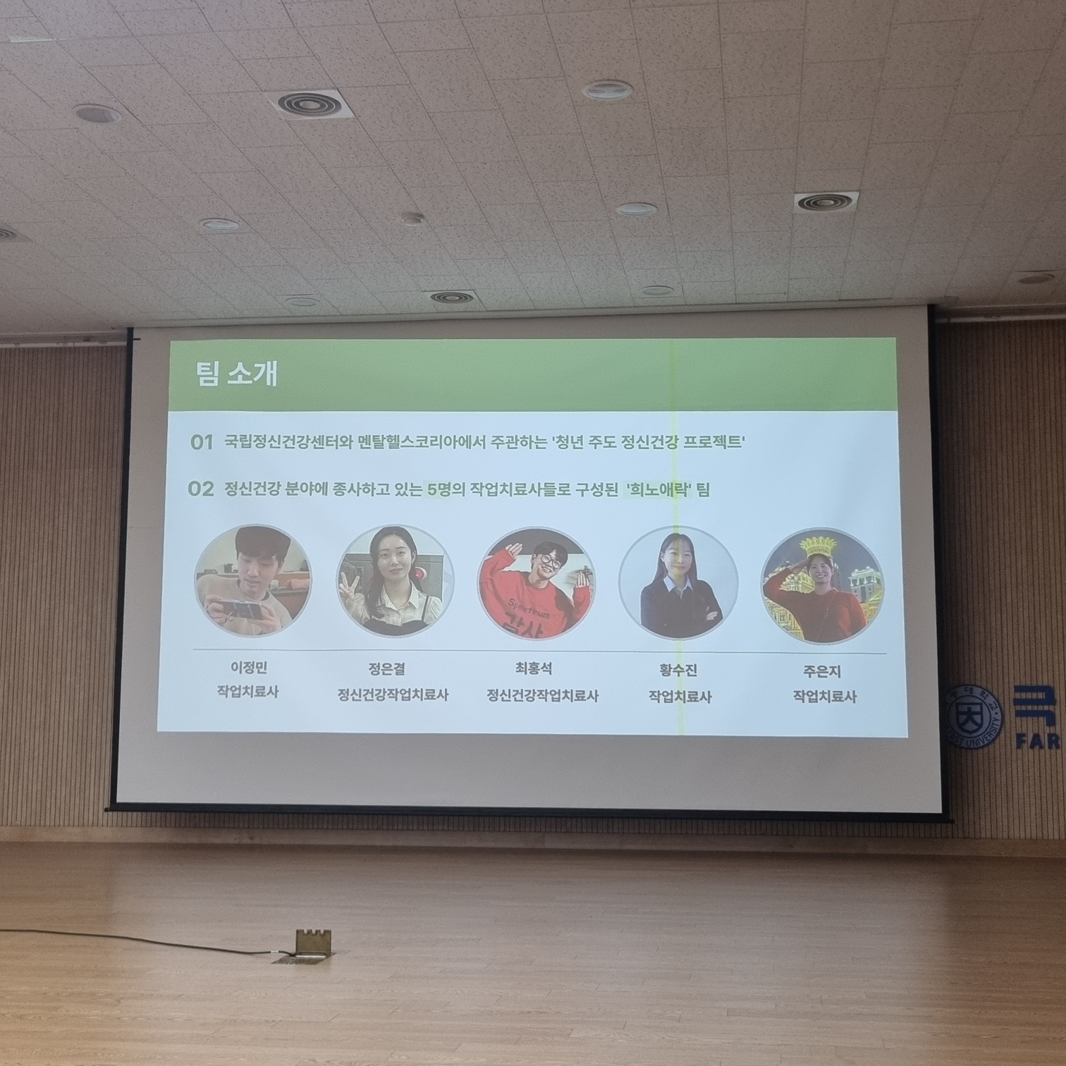 k동 강당에서 정신건강 분야에 종사하고 있으신 5분의 작업치료사로 이루어진 팀인 "희노애락"에서 극동대학교 작업치료학과 학부생들에게