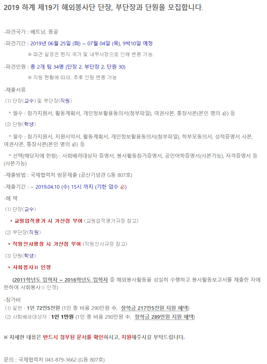 2019학년도 하계 제 19기 해외봉사단 (베트남,몽골) 파견 세부계획(안)