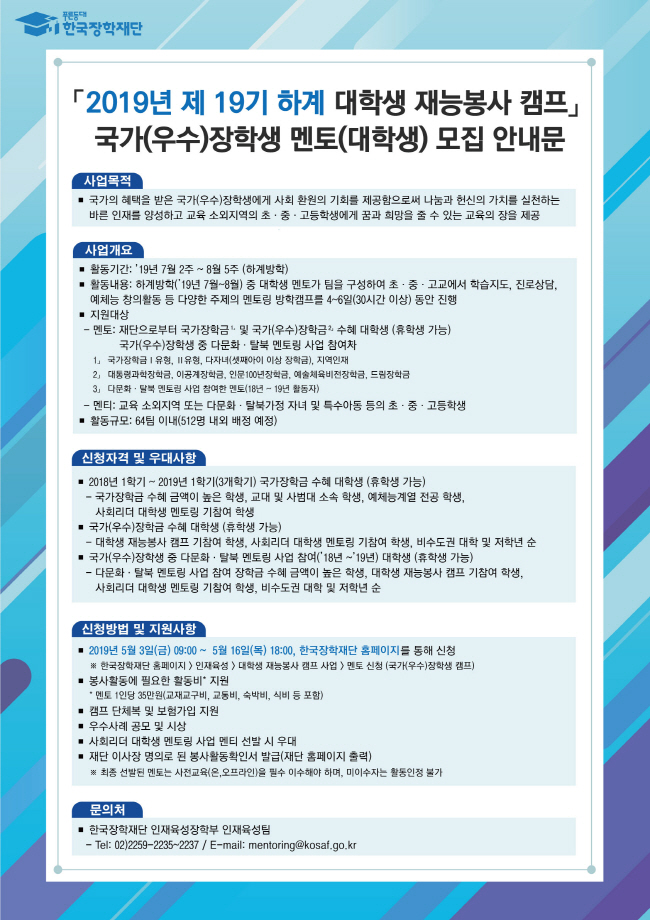 2019년 제19기 하계 대학생 재능봉사 캠프 국가장학생 멘토 모집 안내