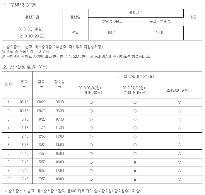 2019학년도 하계방학 버스 운행 안내