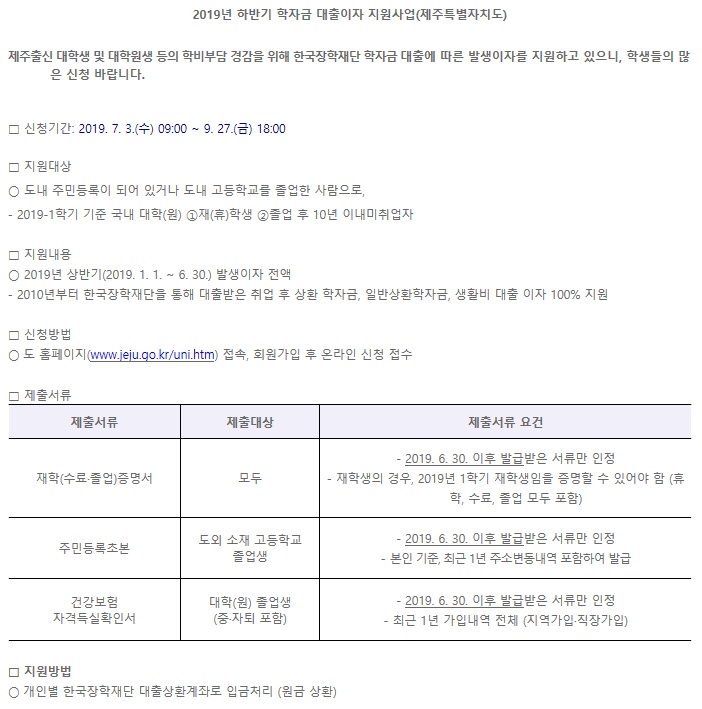 2019년 하반기 학자금 대출이자 지원사업(제주특별자치도)