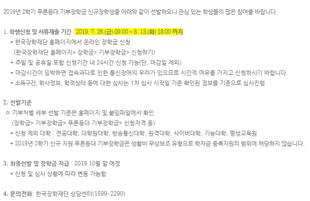 2019년 2학기 푸른등대 기부장학금(신규) 학생 신청 안내
