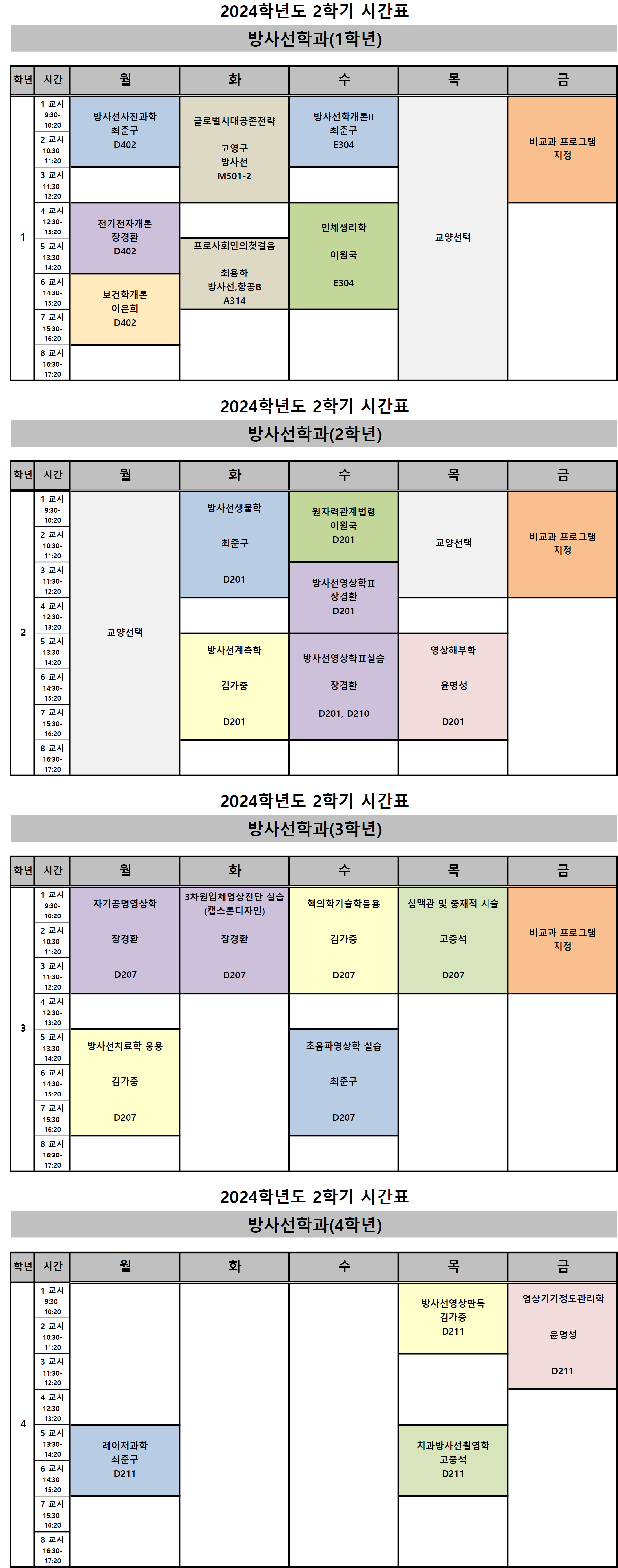 2024학년도 2학기 방사선학과 시간표 입니다.