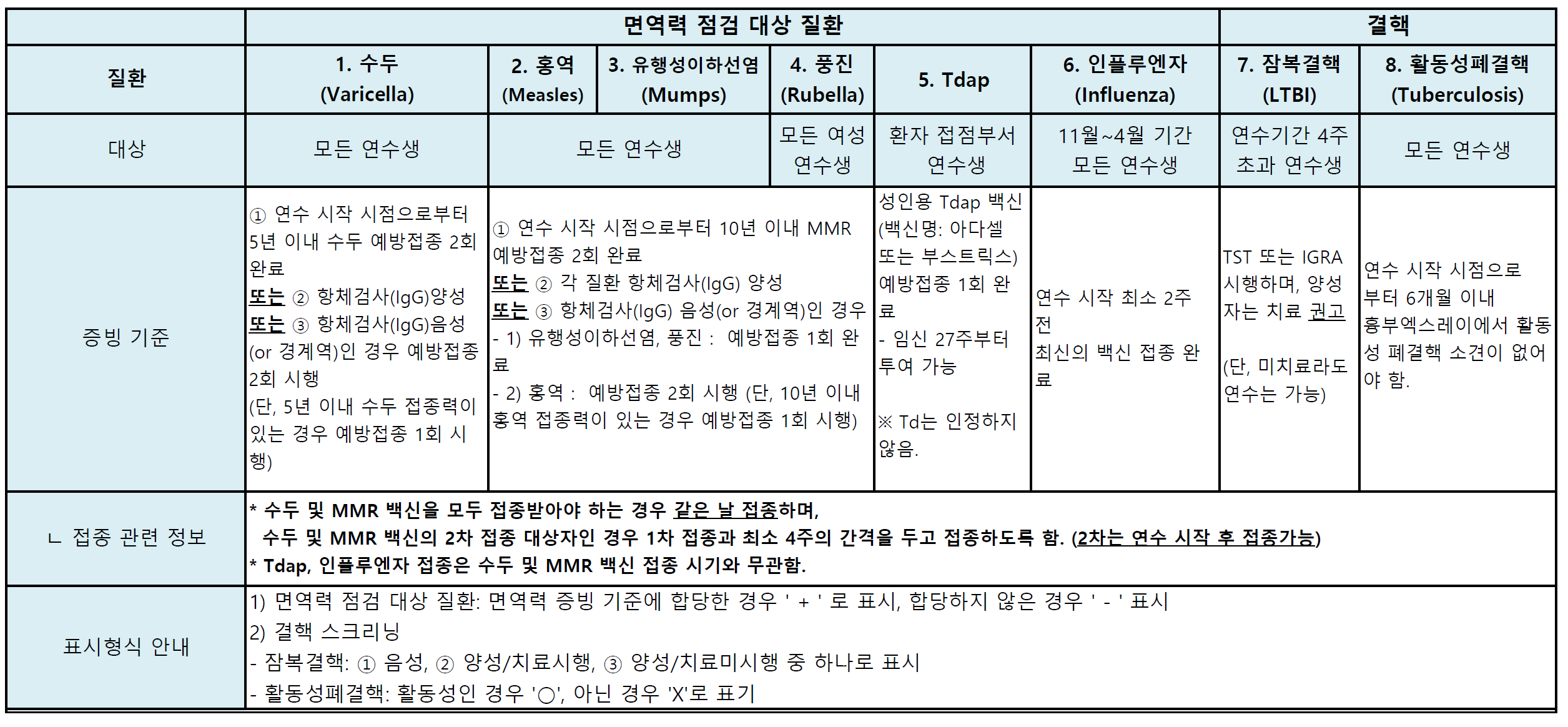 아래의 면역현황표를 확인하여 해당 내용과 관련하여 실습을 못하게 되는 일이 발생하지 않도록 해주시기 바랍니다.
