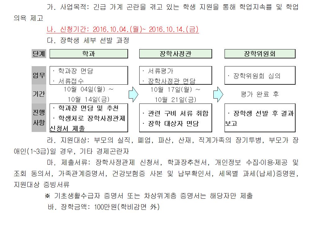 <2016학년도 2학기 장학사정관제 장학금 신청 안내>