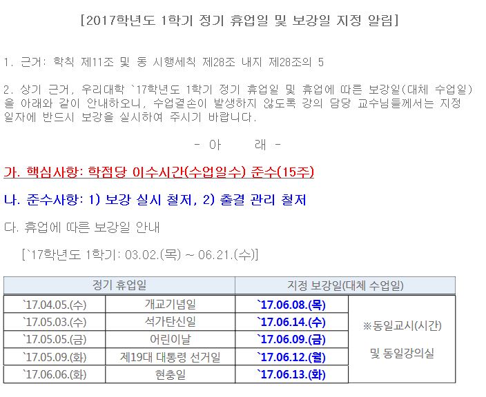 2017학년도 1학기 정기 휴업일 및 지정 보강일 안내