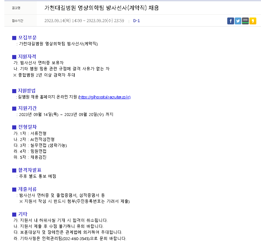 [가천대길병원] 영상의학팀 방사선사(계약직) 채용 게시글 상세보기 - 작성자, 조회수, 등록일, 첨부파일, 상세내용, 이전글, 다음글 제공