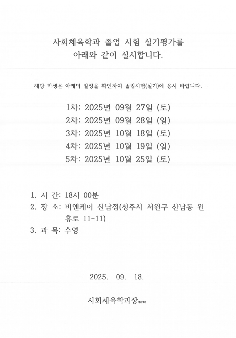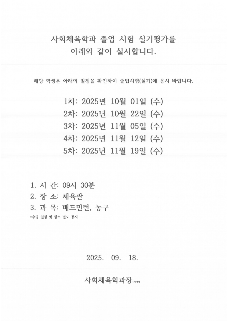 2025학년도 졸업 실기 일정 안내 게시글 상세보기 - 작성자, 조회수, 등록일, 첨부파일, 상세내용, 이전글, 다음글 제공